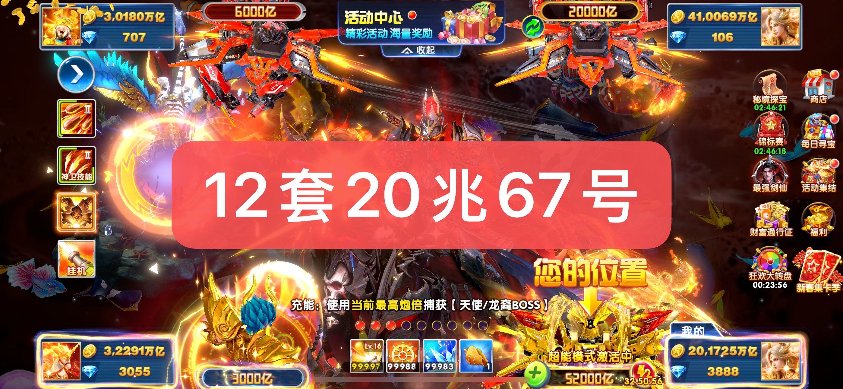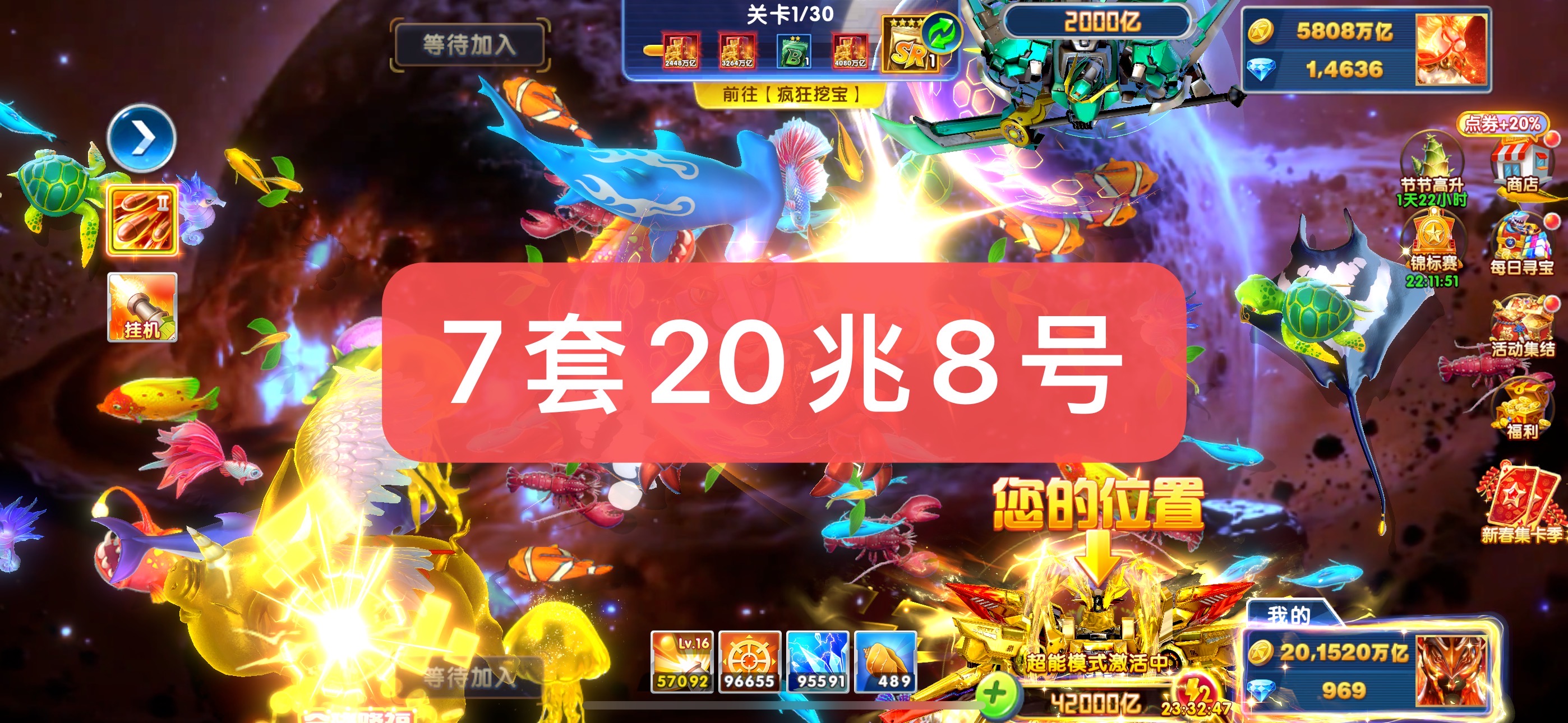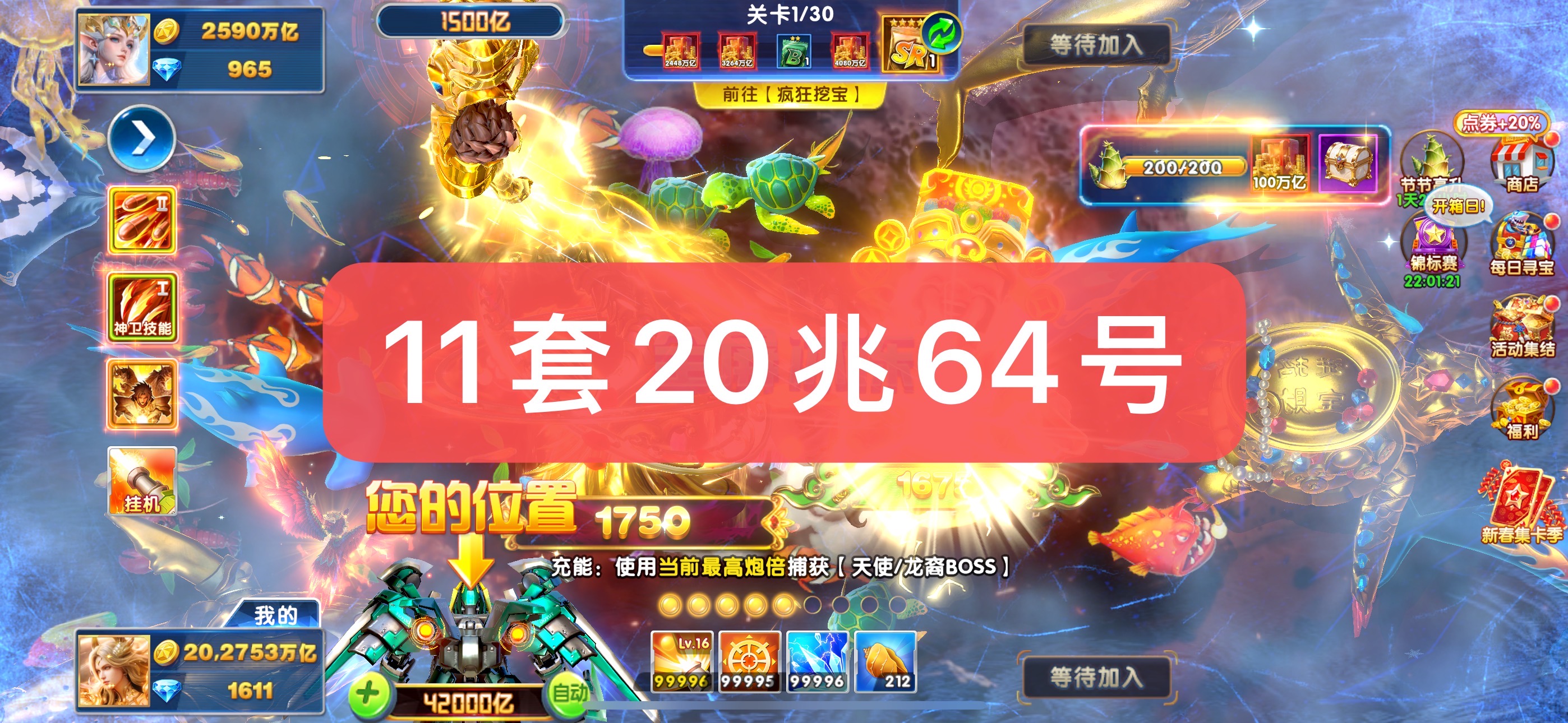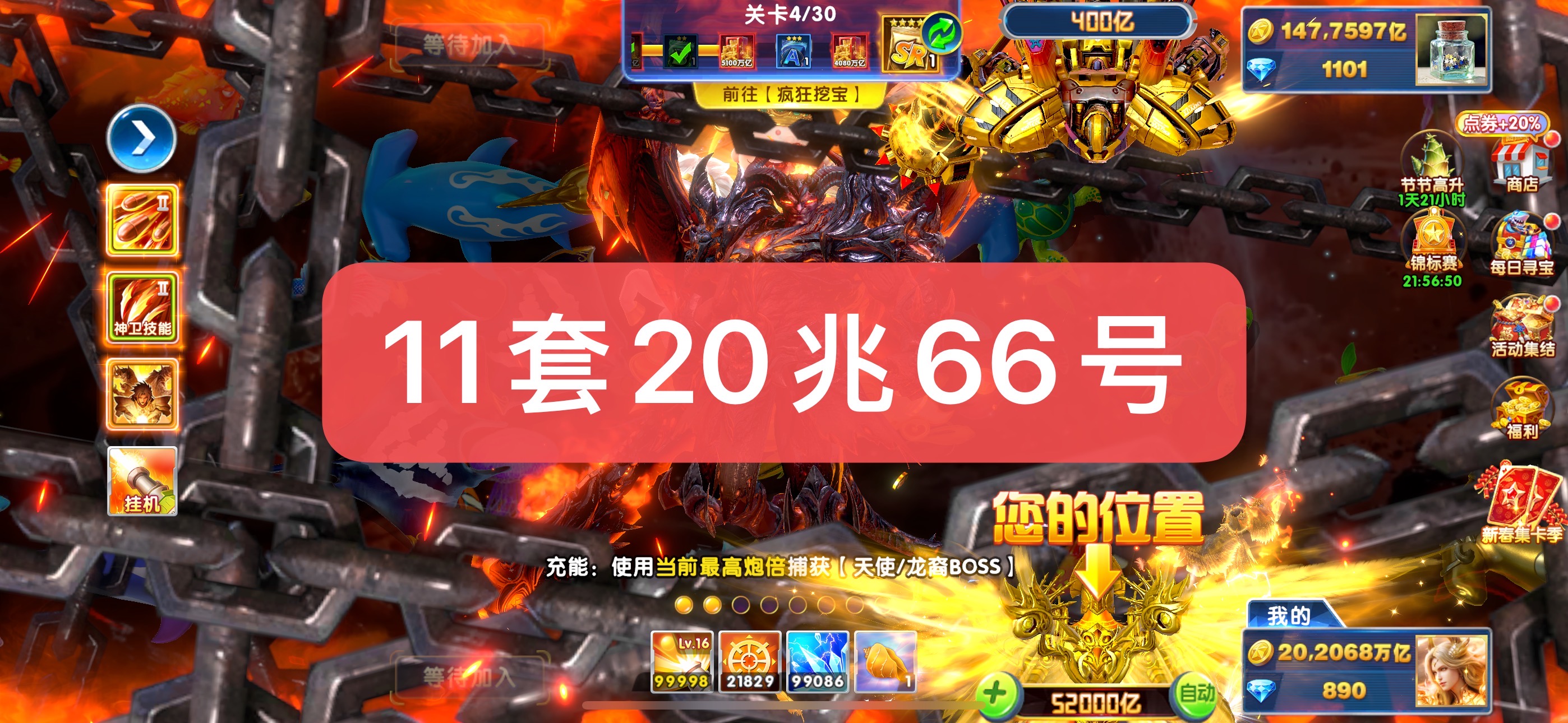 捕鱼大作战金币号出租,20兆金币!官方版本代码登录,苹果安卓全平台通用,上号超简单!一手货源,安全稳定,账号资源丰富!战神多,分段多,道具全,体验好,咨询客服选号!