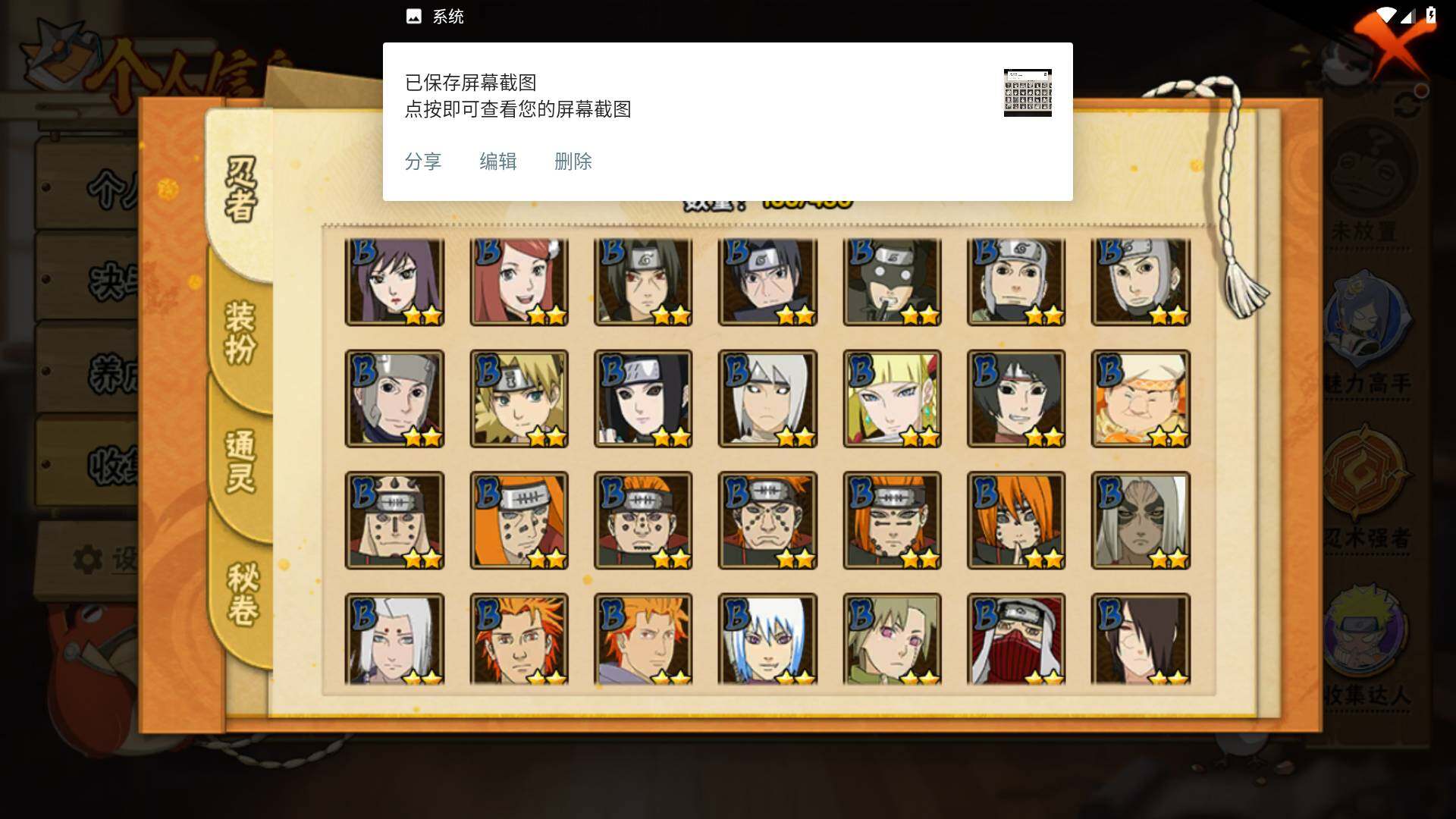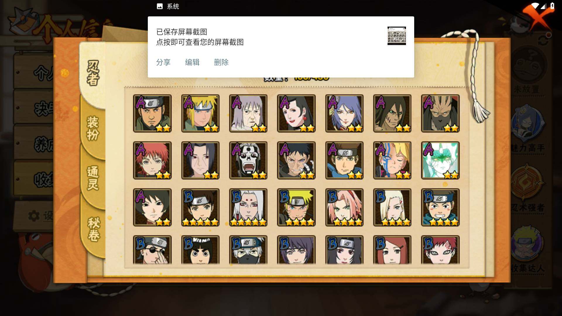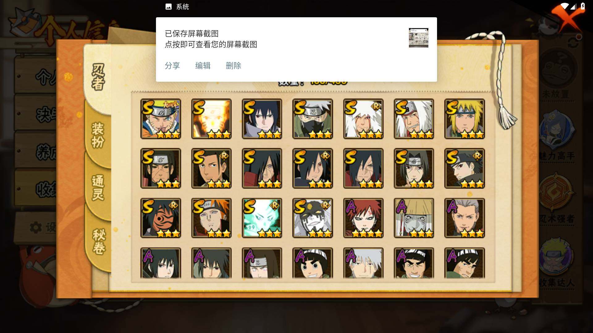 【S级忍者】:千手柱间「秽土转生」(3星),宇智波斑「秽土转生」(3星),宇智波斑「秽土转生·解」(3星),宇智波鼬「须佐能乎」(3星),宇智波止水「须佐能乎」(3星),旗木卡卡西「须佐能乎」(3星),宇智波斑「木叶创立」(3星),千手柱间「木叶创立」(3星),自来也「舞之豪杰」(3星)
