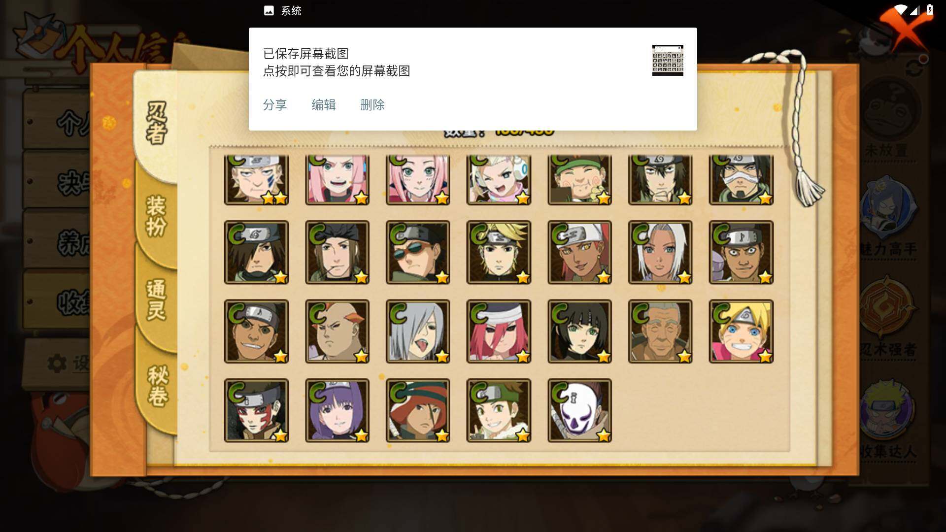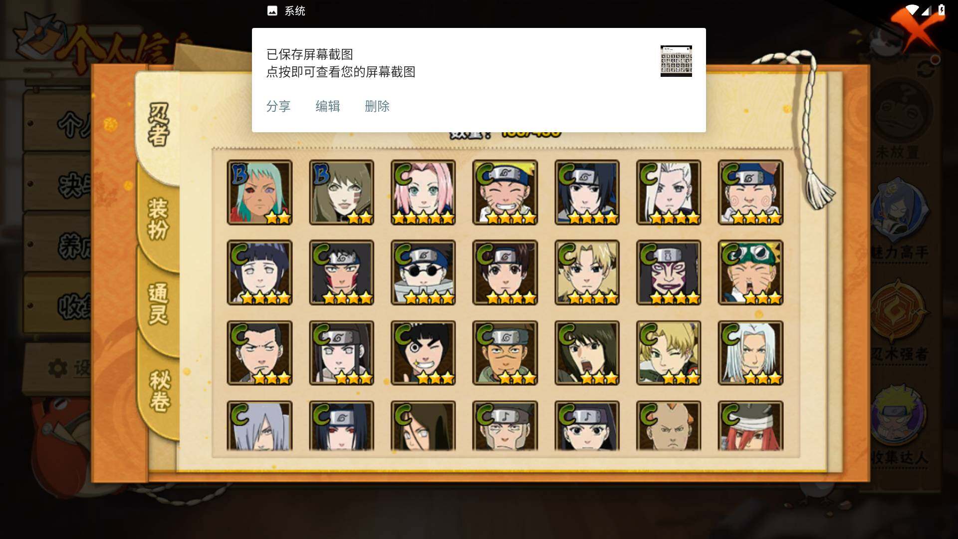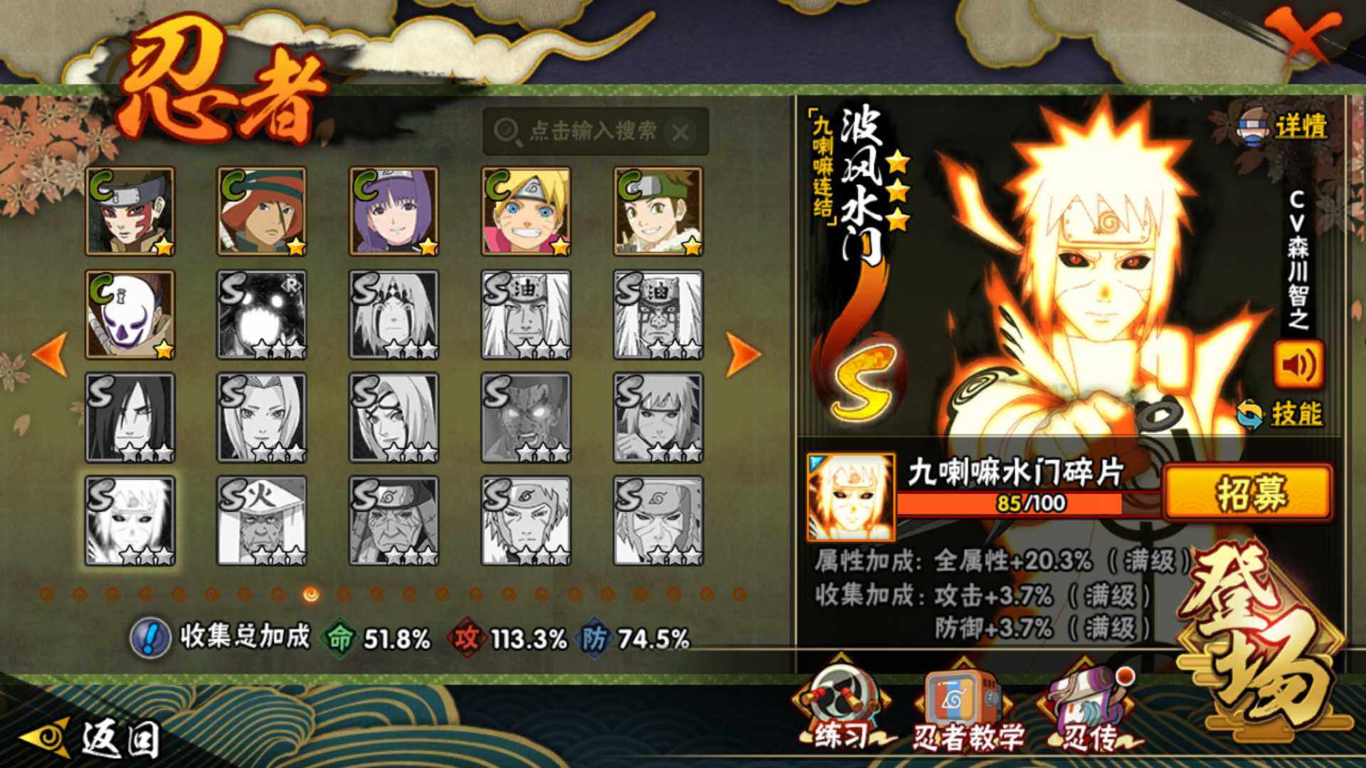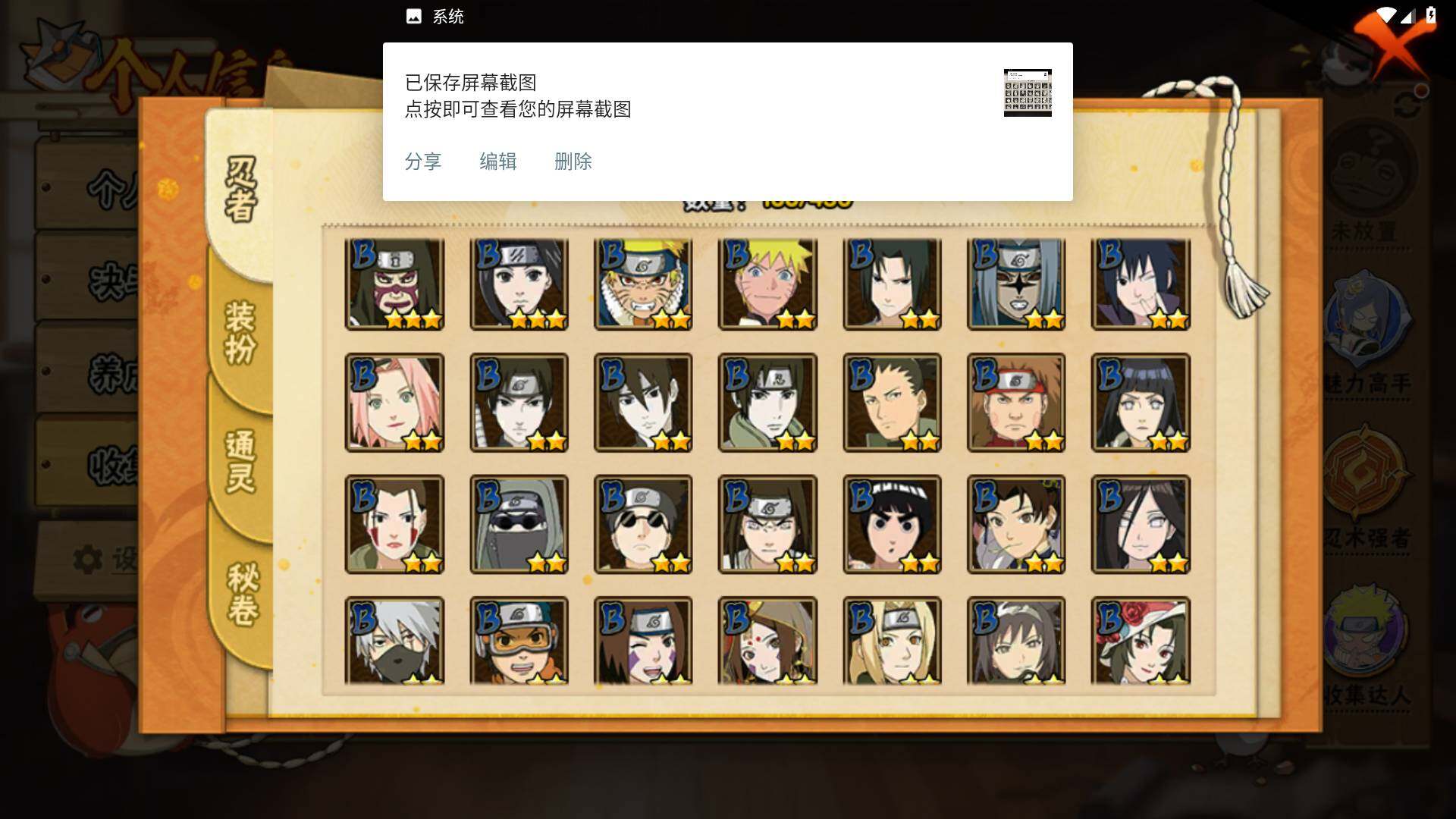 【S级忍者】:千手柱间「秽土转生」(3星),宇智波斑「秽土转生」(3星),宇智波斑「秽土转生·解」(3星),宇智波鼬「须佐能乎」(3星),宇智波止水「须佐能乎」(3星),旗木卡卡西「须佐能乎」(3星),宇智波斑「木叶创立」(3星),千手柱间「木叶创立」(3星),自来也「舞之豪杰」(3星)