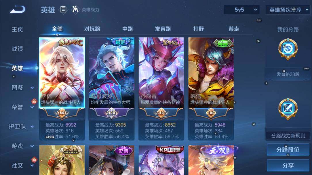 贵族6/皮肤265/传说16/史诗69/英雄127/孙权全皮/橘右京全皮/蒙恬全