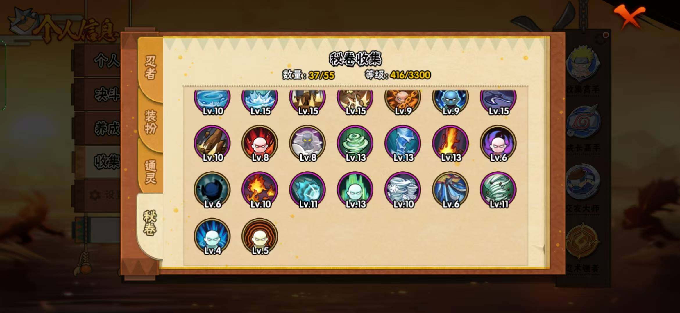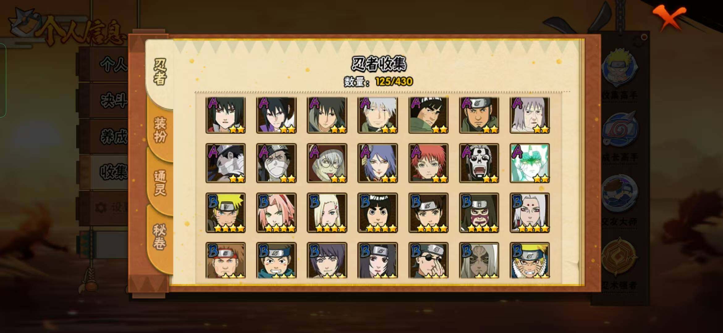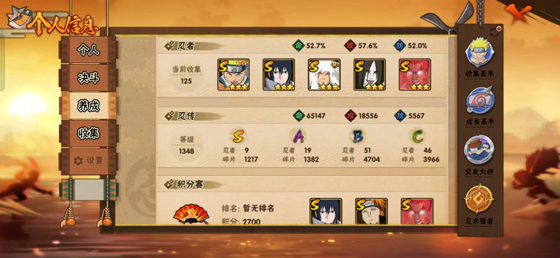 【S级忍者】:宇智波鼬「秽土转生」(3星),宇智波鼬「须佐能乎」(3星),自来也「舞之豪杰」(3星),大蛇丸(3星),迈特凯「死门」(3星),佩恩「天道」(3星),宇智波佐助「永恒万花筒」(3星),波风水门「九喇嘛连结」(3星),漩涡鸣人·宇智波佐助(3星)
