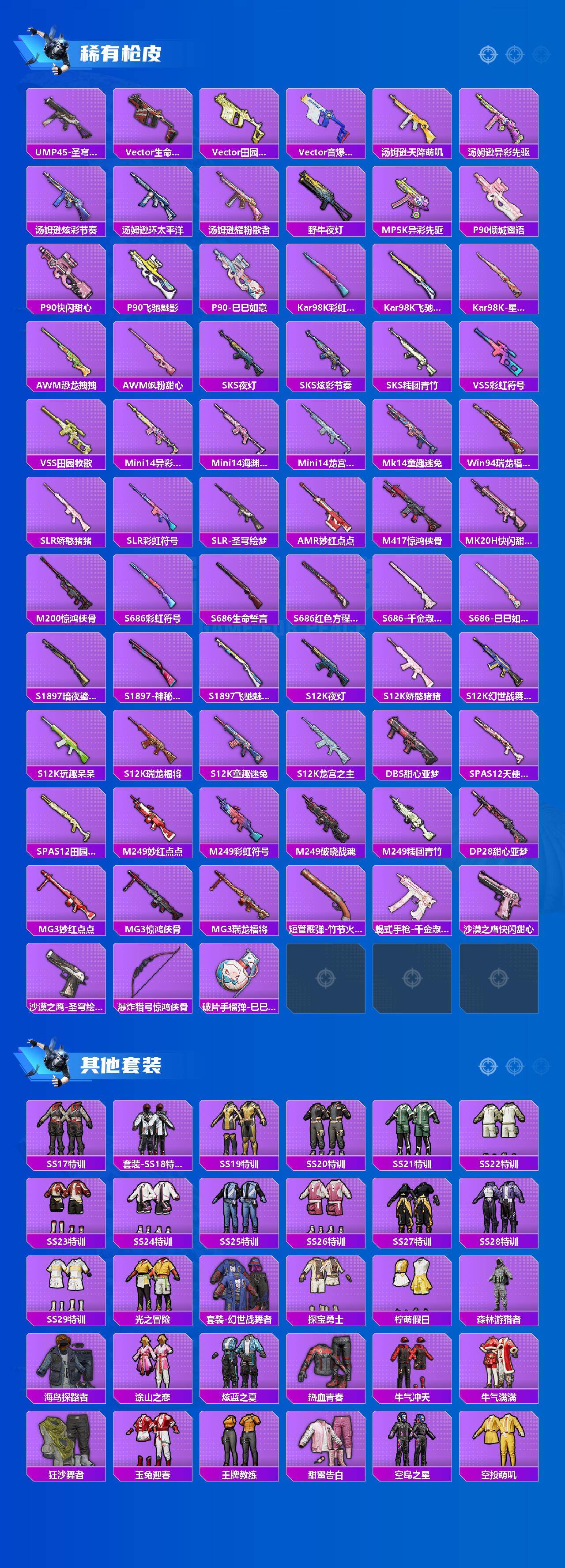 【粉色枪皮等级】:M416-心之恋语(七级),AUG-暖羊咩咩(五级),Vector-飒粉甜心(七级),Kar98K-巳巳如意(五级),爆炸猎弓-拳皇·狂花道(六级)