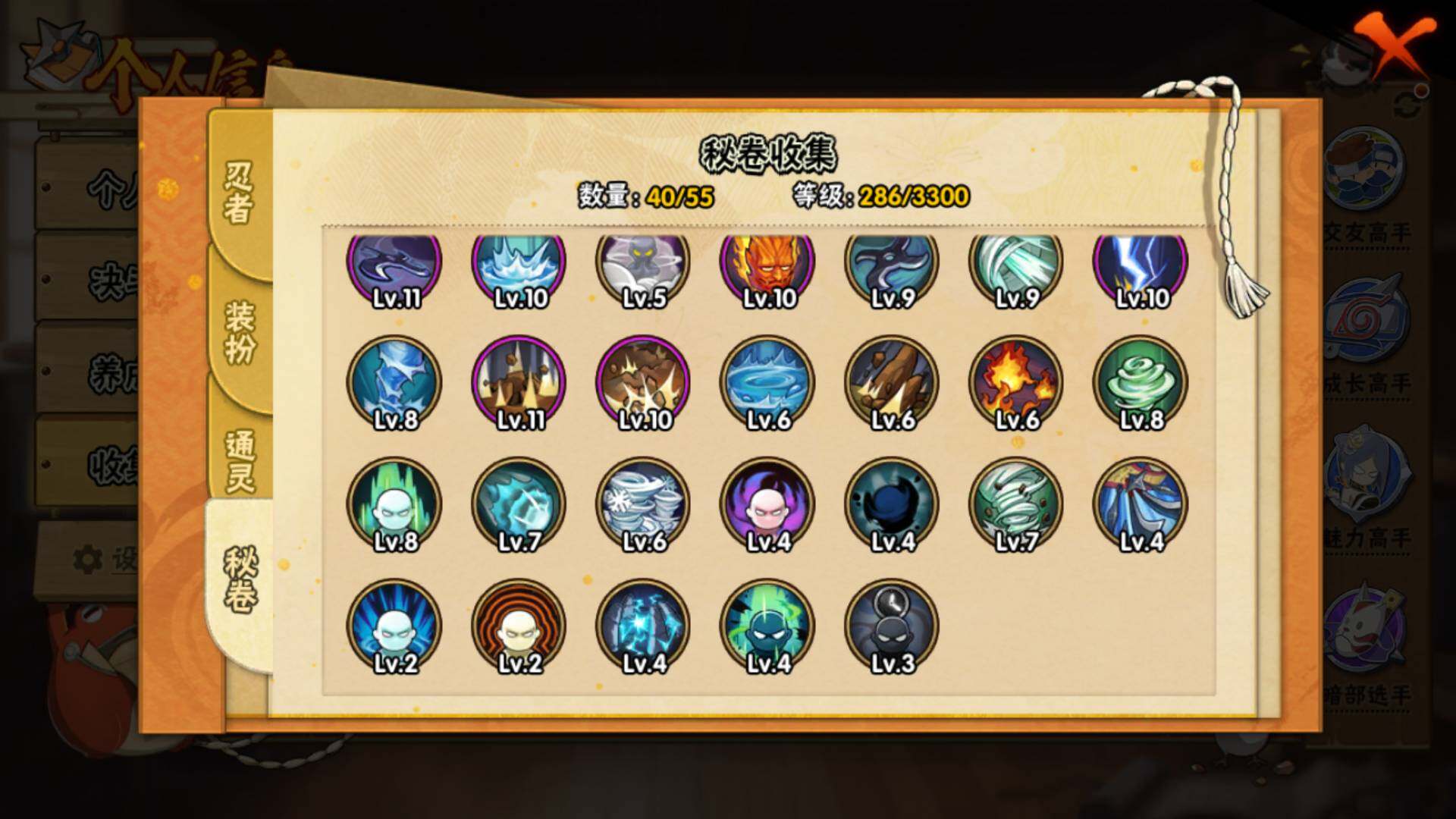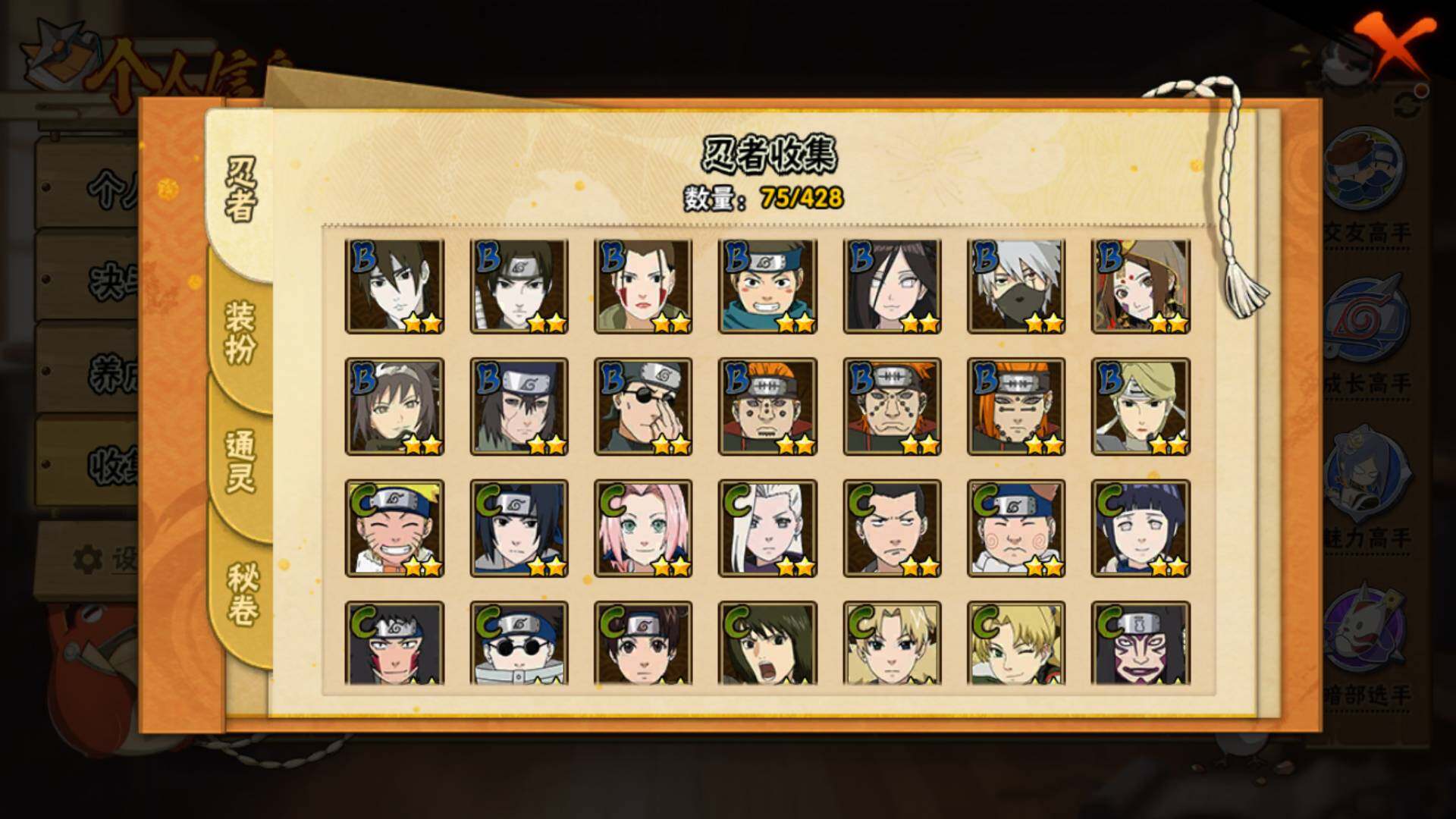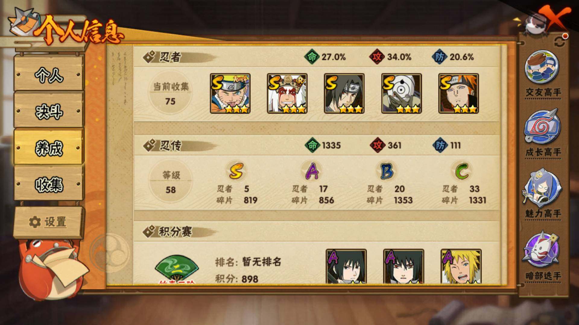【S级忍者】:宇智波鼬「须佐能乎」(3星),自来也「舞之豪杰」(3星),佩恩「天道」(3星),宇智波斑 「白面具」(3星宇智波斑「白面具」),漩涡鸣人·宇智波佐助(3星)