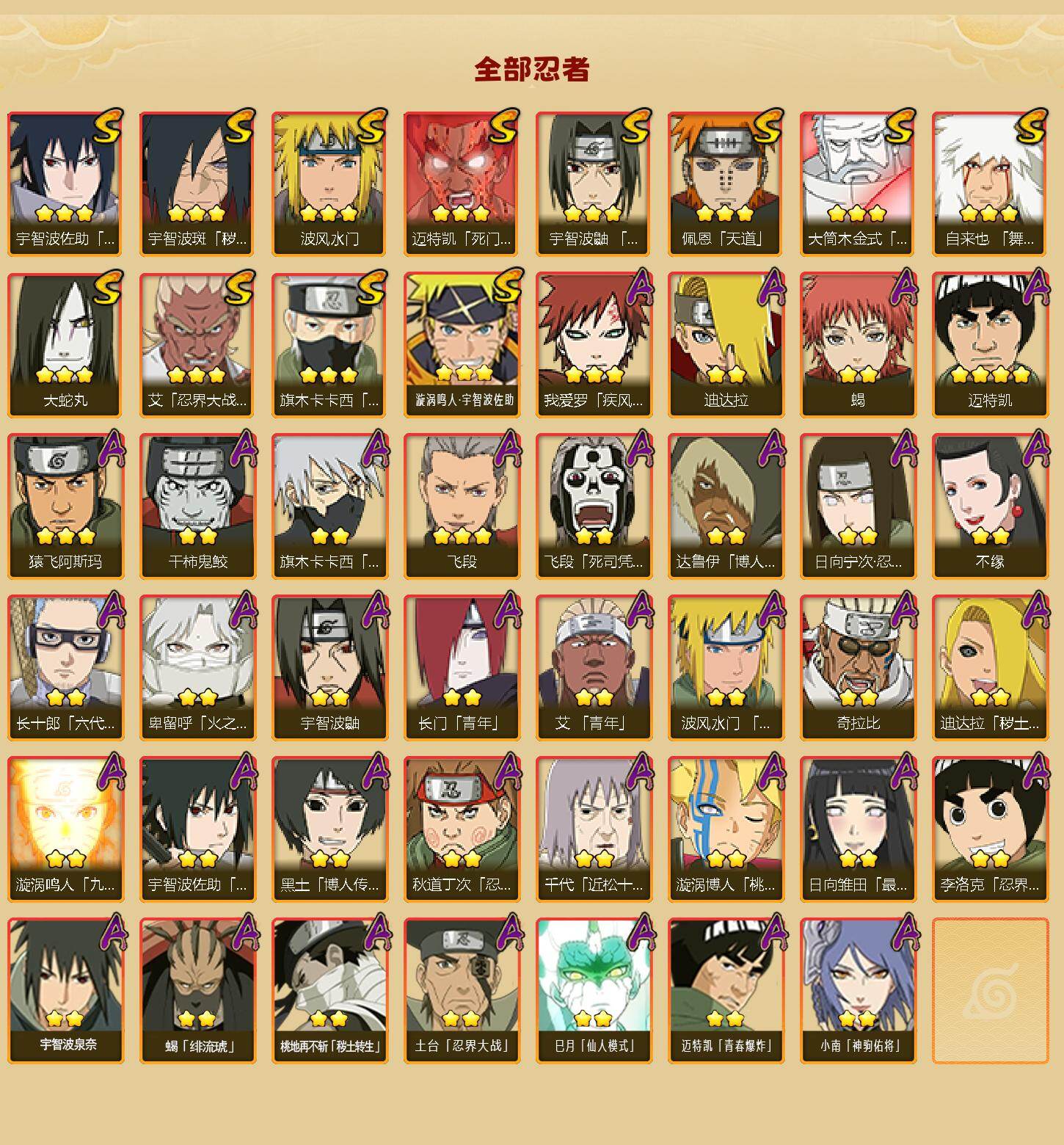 【S级忍者】:宇智波斑「秽土转生·解」(3星),艾「忍界大战」(3星),宇智波鼬「须佐能乎」(3星),旗木卡卡西「须佐能乎」(3星),自来也「舞之豪杰」(3星),大蛇丸(3星),波风水门(3星),迈特凯「死门」(3星),佩恩「天道」(3星),宇智波