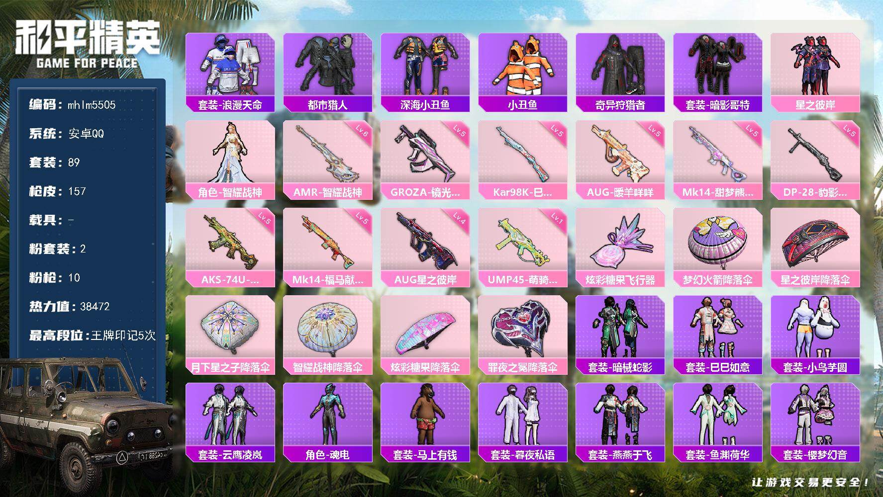 【mhlm5505】安卓 手Q-2粉装-10特效枪-0载具-1粉色飞行器-38472热力值-5王牌印记-89套装-157枪皮