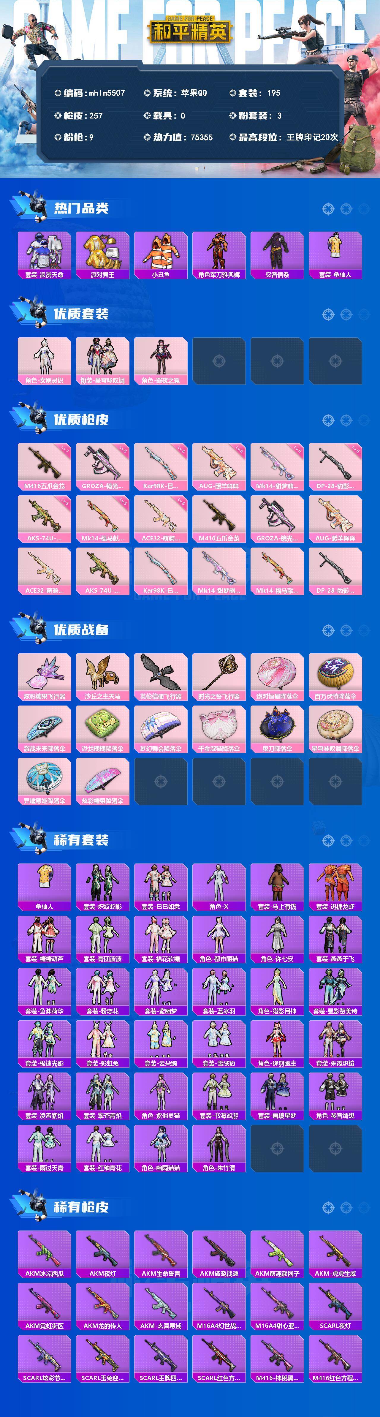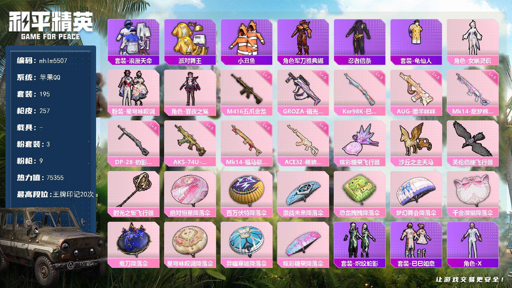 【mhlm5507】苹果 手Q-3粉装-9特效枪-0载具-4粉色飞行器-75355热力值-20王牌印记-195套装-257枪皮