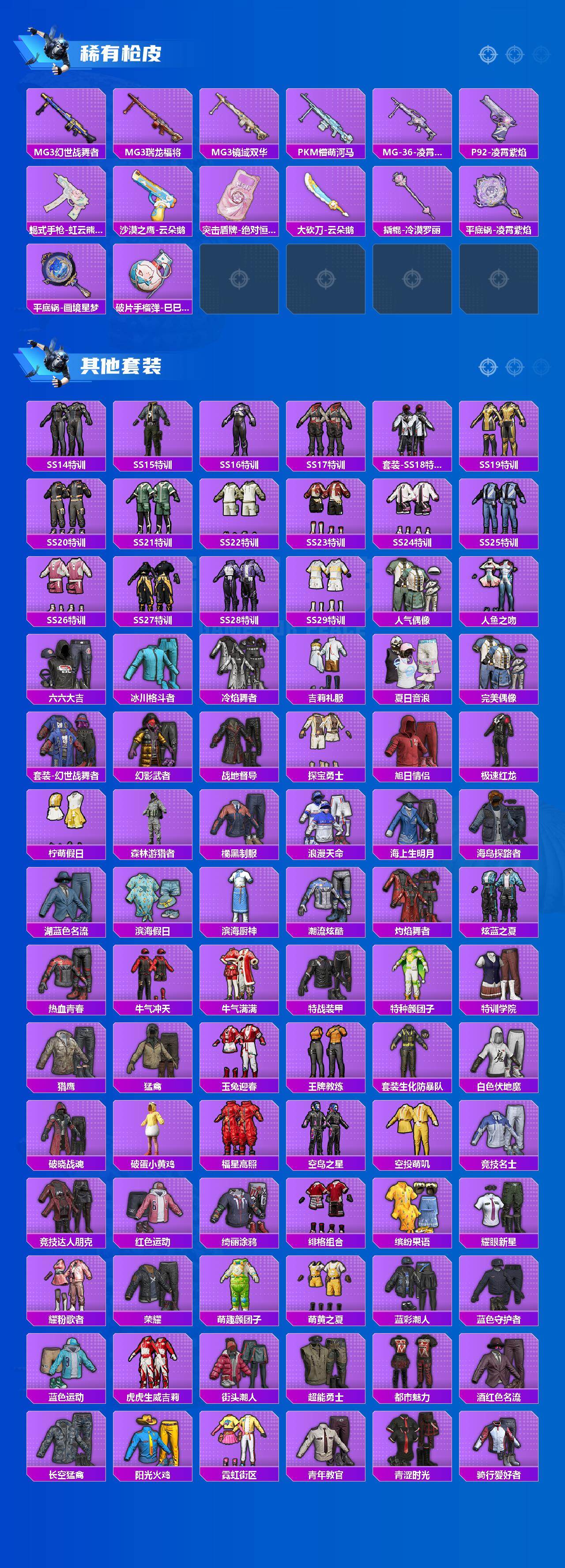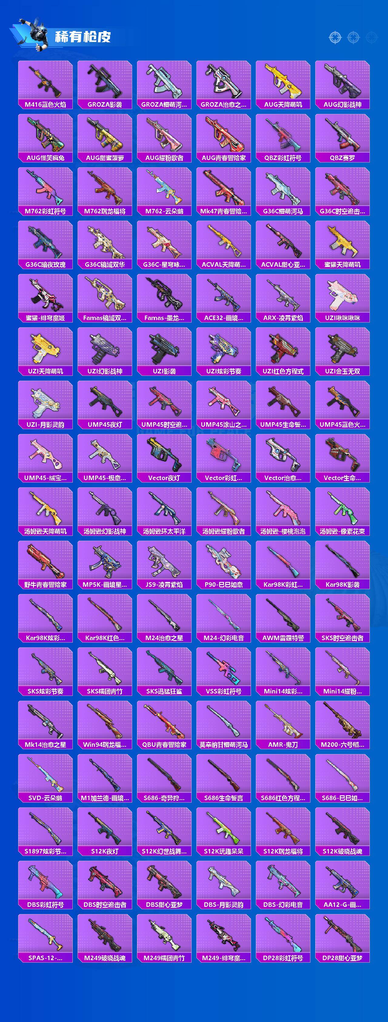 【粉色枪皮等级】:M416-五爪金龙(七级),GROZA-镜光银凌(五级),AUG-暖羊咩咩(五级