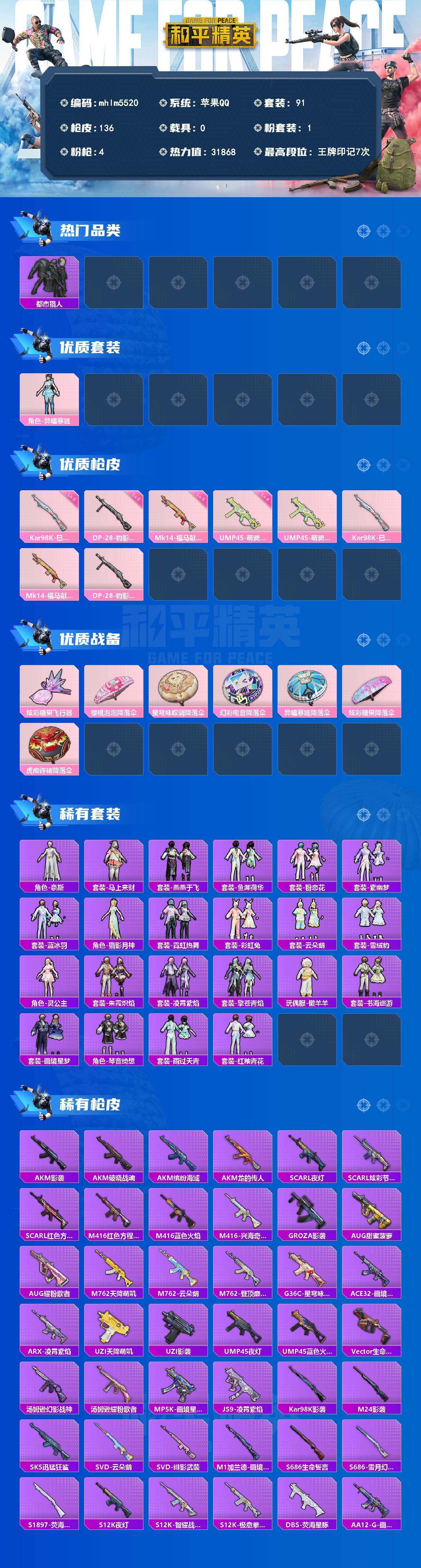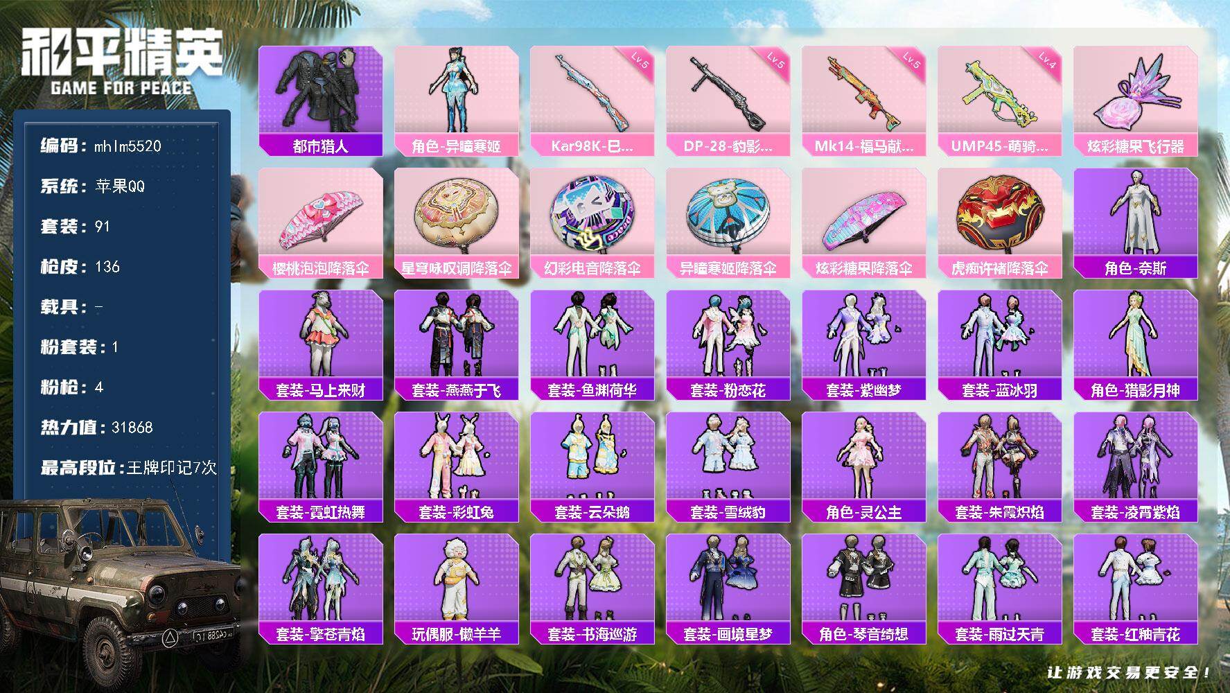 【mhlm5520】苹果 手Q-1粉装-4特效枪-0载具-1粉色飞行器-31868热力值-7王牌印记-91套装-136枪皮