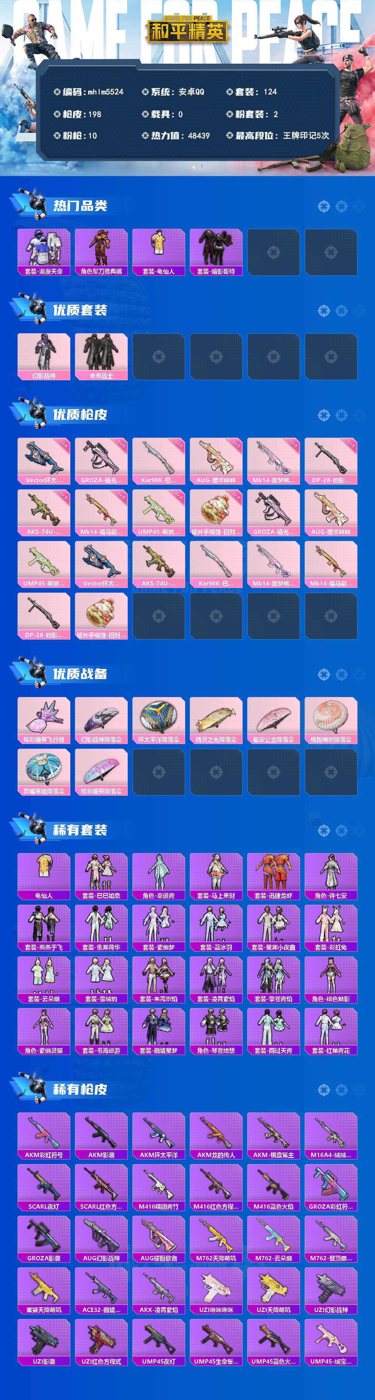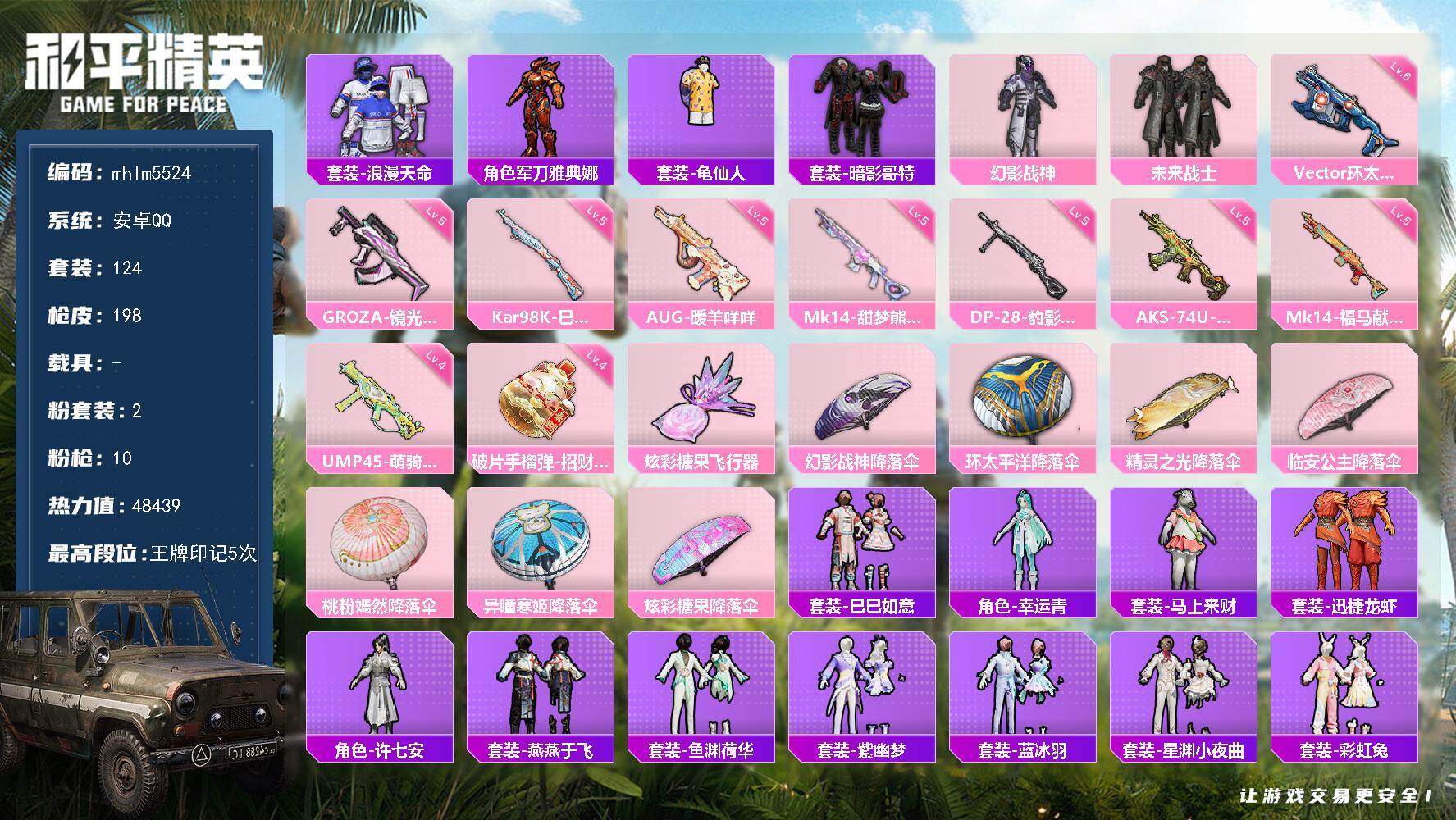 【mhlm5524】安卓 手Q-2粉装-10特效枪-0载具-1粉色飞行器-48439热力值-5王牌印记-124套装-198枪皮