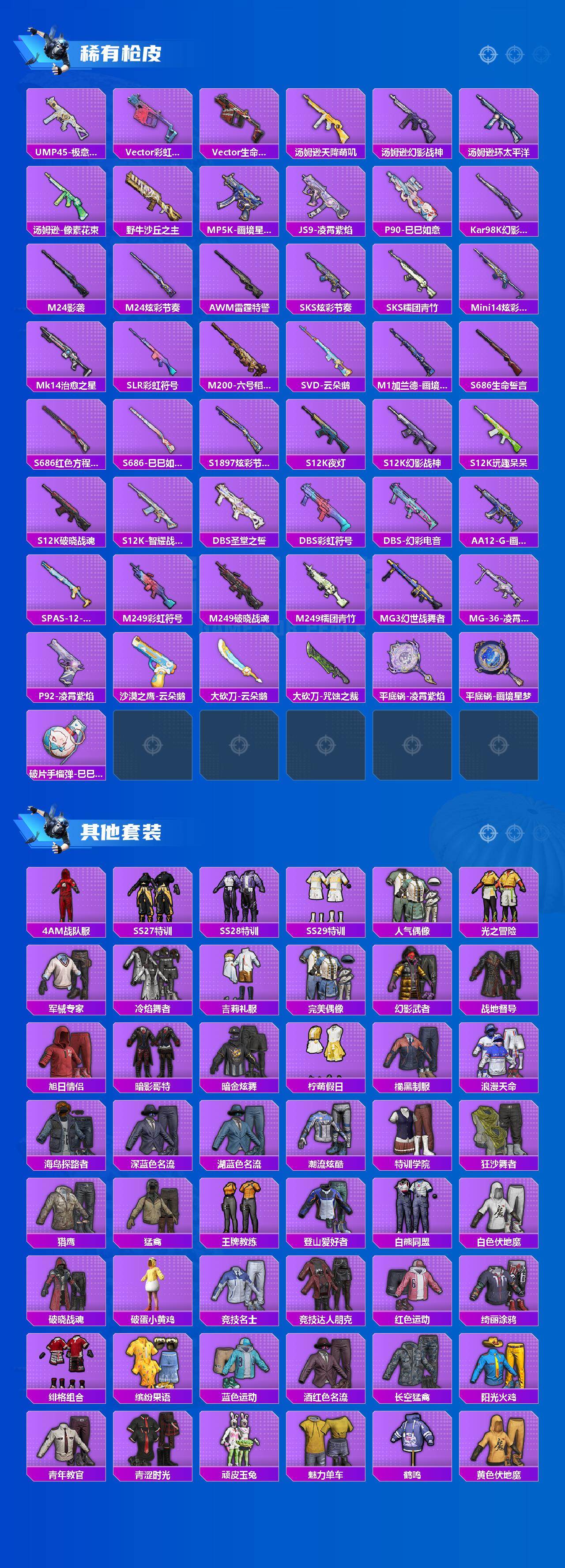 【粉色枪皮等级】:GROZA-镜光银凌(五级),AUG-暖羊咩咩(五级),UMP45-萌骑冒险(四级),Vector-环太平洋(六级),AKS-7