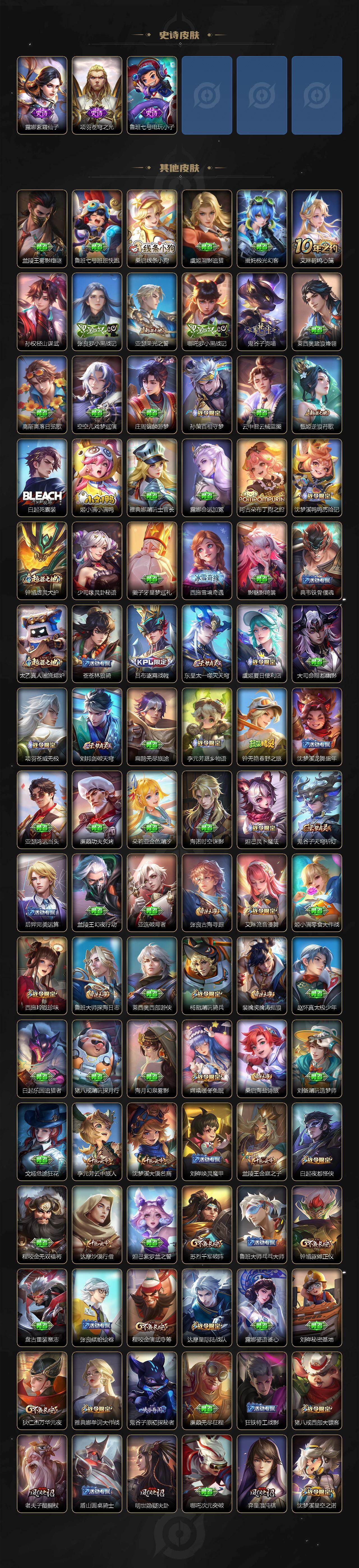 贵族等级10/荣耀典藏数量4/传说皮肤数量36/史诗皮肤数量127/皮肤数量427/英雄数量129/段位最强王者/扁鹊全皮/元歌全皮/孙权全皮/敖隐全皮/空空儿全皮/武则天/全息碎影 孙悟空/鸣剑·曳影 李白/幻阙歌 貂蝉/弑枪猎影 韩信/群星魔术团 韩信/真我赫兹 瑶/朽木白哉 暃/韩信踏浪归/云缨神骥越千峰/花木兰异界灵契/诡秘之主 元歌/曦玄引 吕布/乘龙·淬吴钩 孙策/乘龙·铭钟鼎 赵