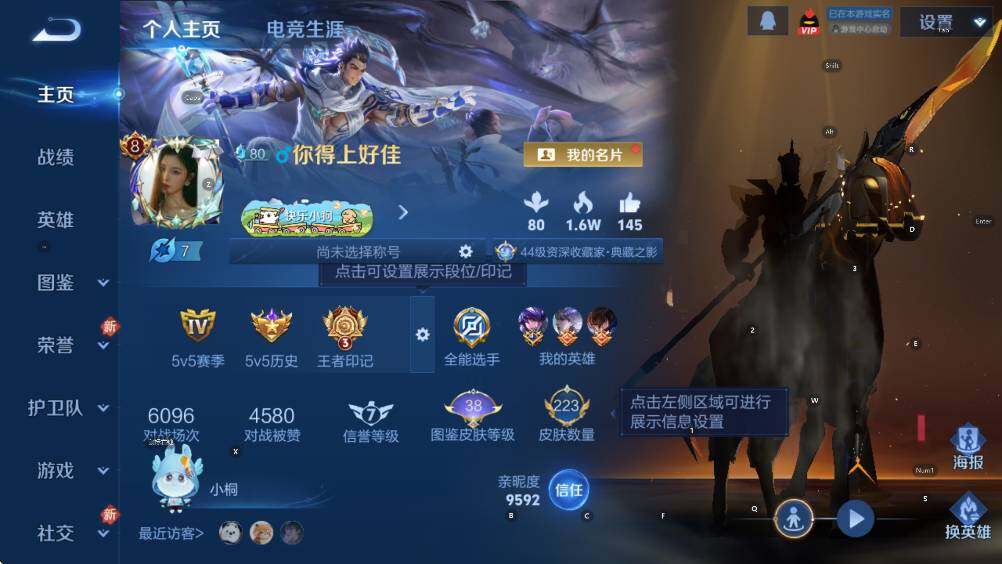 贵族等级8/荣耀典藏数量1/传说皮肤数量19/史诗皮肤数量68/皮肤数量223/英雄数量127/段位至尊星耀/弑枪猎影 韩信/器灵·螭龙剑 曜/雪境奇遇 甄姬/时之奇旅 孙策/江户川柯南 鲁班七号/怪盗基德 马可波罗/云缨神骥越千峰/神树通天 后羿/鸣野蒿 桑启/琥珀纪元 铠/逐花归海 澜/鹤羽星尊 诸葛亮/山海·炽霜斩 李信/诗剑行 李白/绯月行 不知火舞/无双飞将 马超/淬星耀世 赵云/音