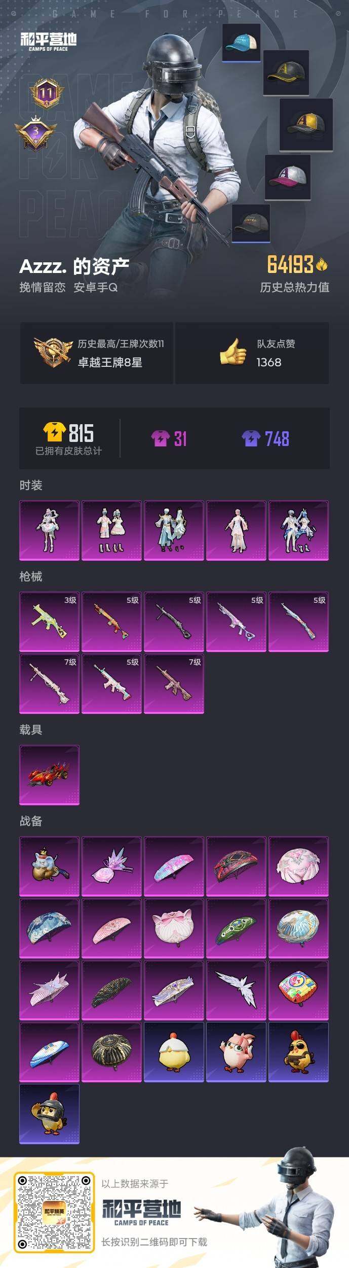 安卓 手Q-5粉装-8特效枪-1载具-3粉色飞行器-64193热力值-11王牌印记-163套装-201枪皮