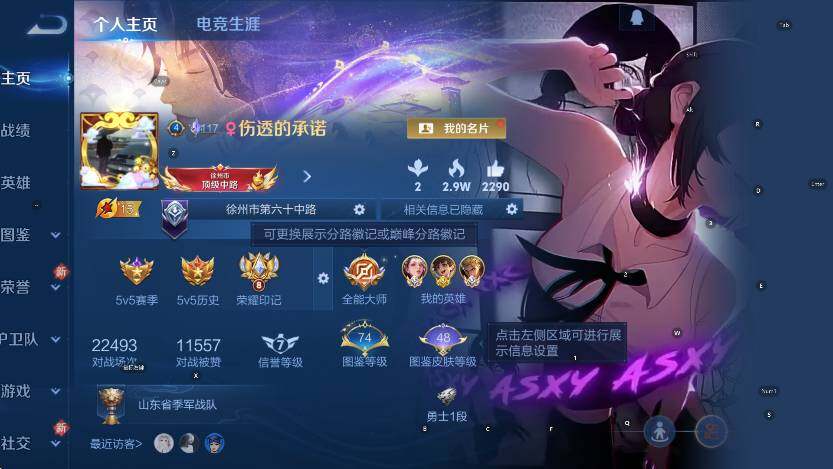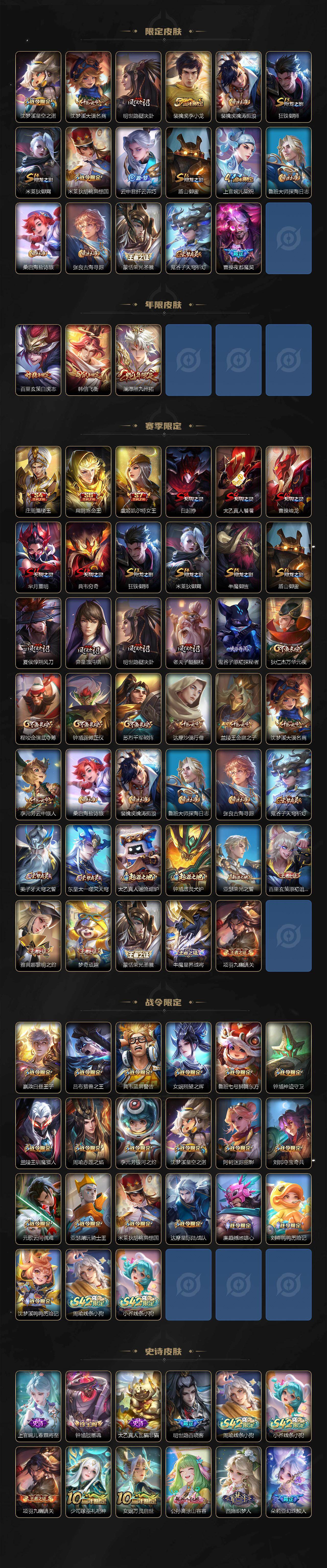 贵族等级8/荣耀典藏数量2/传说皮肤数量15/史诗皮肤数量89/皮肤数量312/英雄数量127/段位最强王者/姜子牙全皮/孙权全皮/敖隐全皮/幻阙歌 貂蝉/吕布千魇归渊/李信问心剑/孙悟空无相/雪境奇遇 甄姬/伽罗沧流箭/器灵·落星盏 嫦娥/云缨神骥越千峰/狄仁杰神骥赴朔漠/马超神骥逐星野/李元芳星君娄金/云诺千山 公孙离/愿照·九州拓 澜/鸣野蒿 桑启/灼幽烈阳 东皇太一/启明星使 虞姬/猫