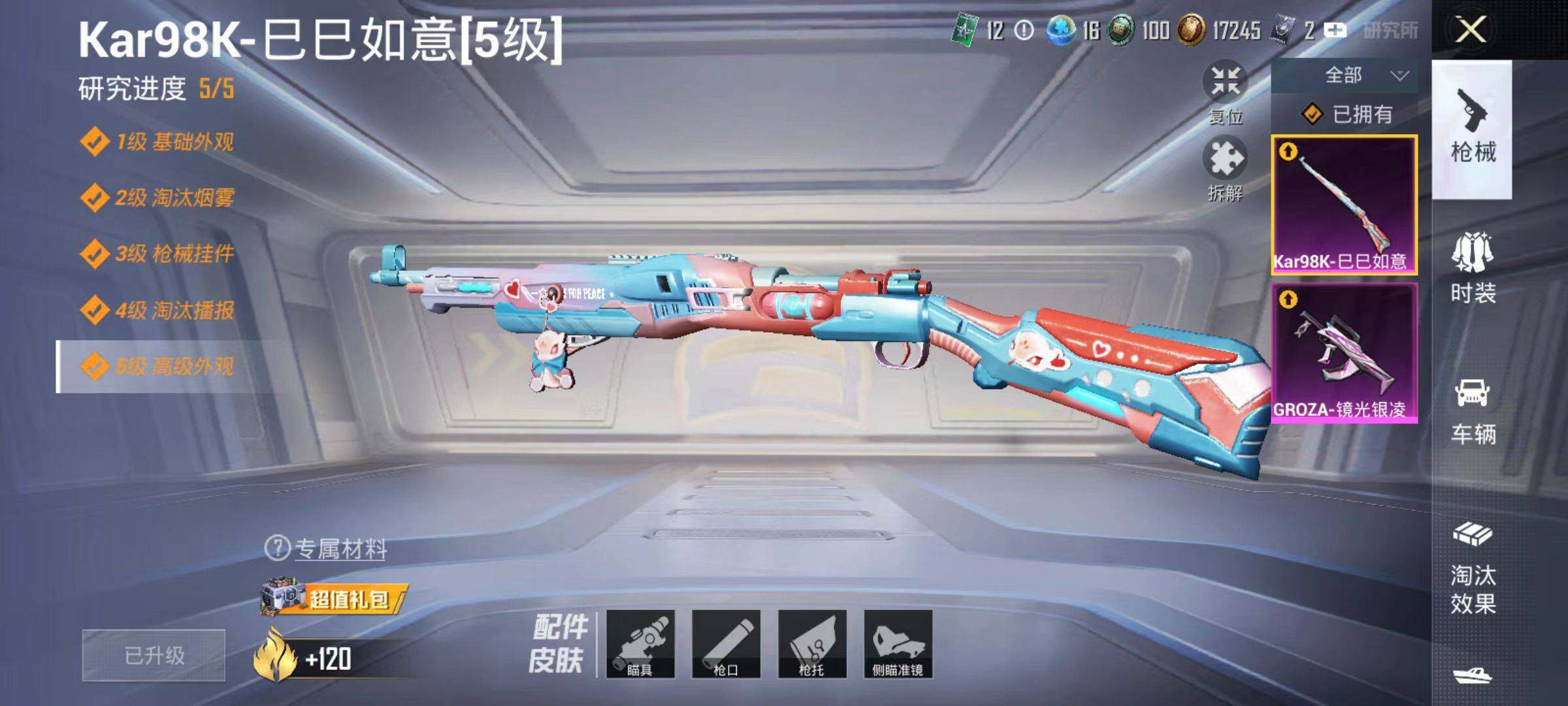 【特效枪等级】:GROZA-镜光银凌(五级),Kar98K-巳巳如意(五级)