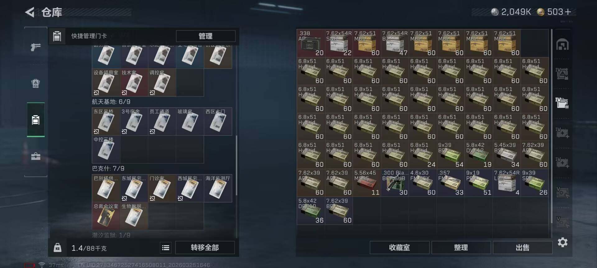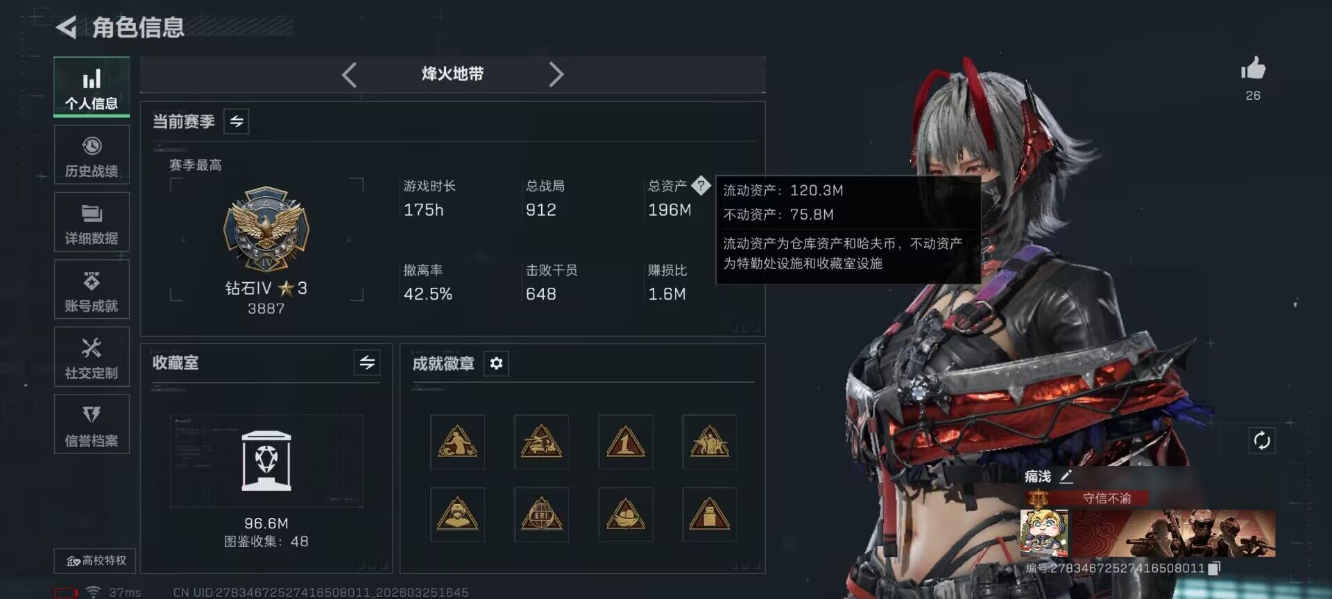 总资产(M):196M/哈夫币(K):2049K/ 传说枪皮数:29/全面战场等级:27_段位:尉官/烽火地带等级:60_段位:钻石/