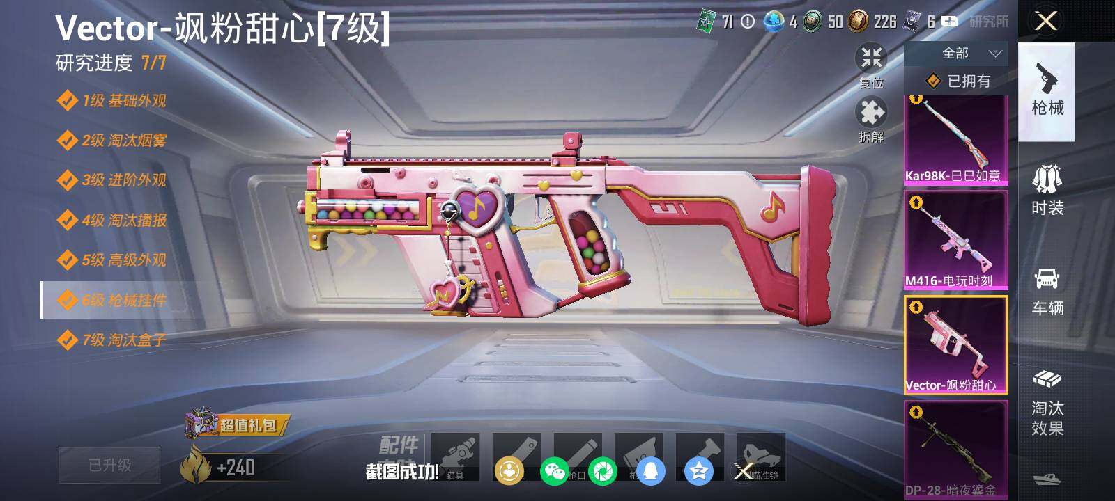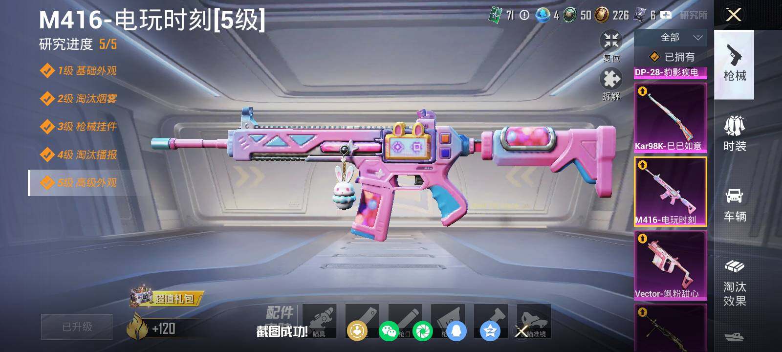 【粉色枪皮等级】:M416-电玩时刻(五级),ACE32-萌骑漫游(一级),Vector-飒粉甜心(七级),Kar98K-巳巳如意(五级),Mk14-福马献瑞(四级),DP-28-暗夜鎏金(七级),DP-