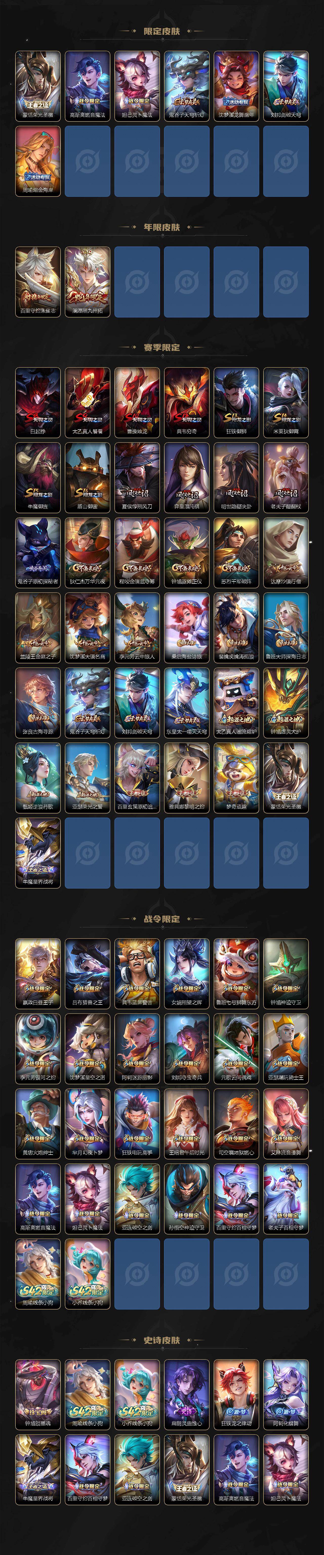 【传说皮肤】:狄仁杰神骥赴朔漠,澜愿照九州拓,云缨幻光神枪,桑启鸣野蒿,宫本武藏惊梅引,诸葛亮鹤羽星尊,孙悟空齐天大圣,李白诗剑行,百里守约碎云,铠绛天战甲,虞姬启明星使,曜云鹰飞将,李信一念神魔,刘备时之恋人,干将莫邪久胜战神,梦奇胖达荣荣,后羿黄金射手座,貂蝉仲夏夜之梦