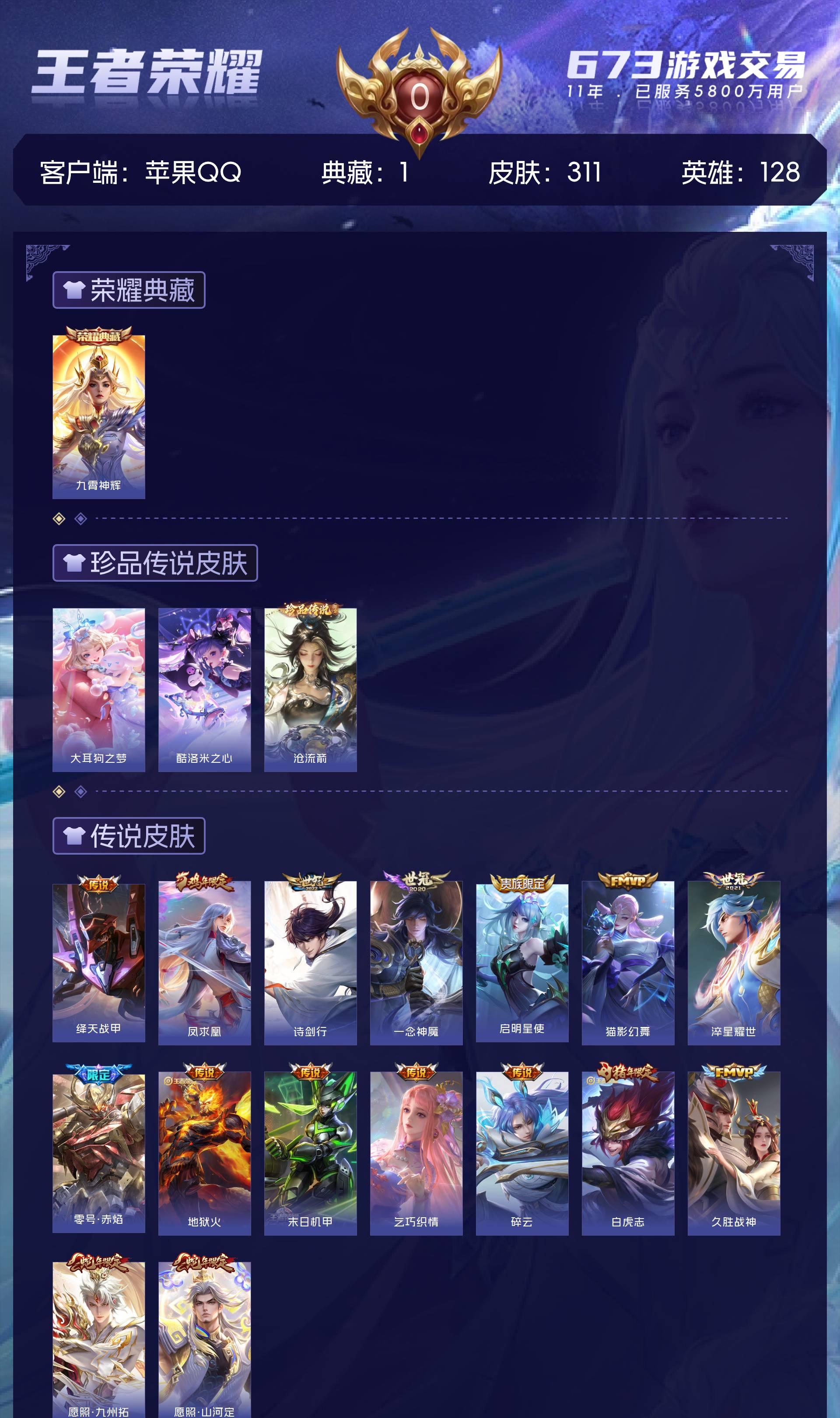 苹果QQ 可二次 皮肤311 英雄128 永恒钻石 荣耀典藏1 珍品传说3 传说16