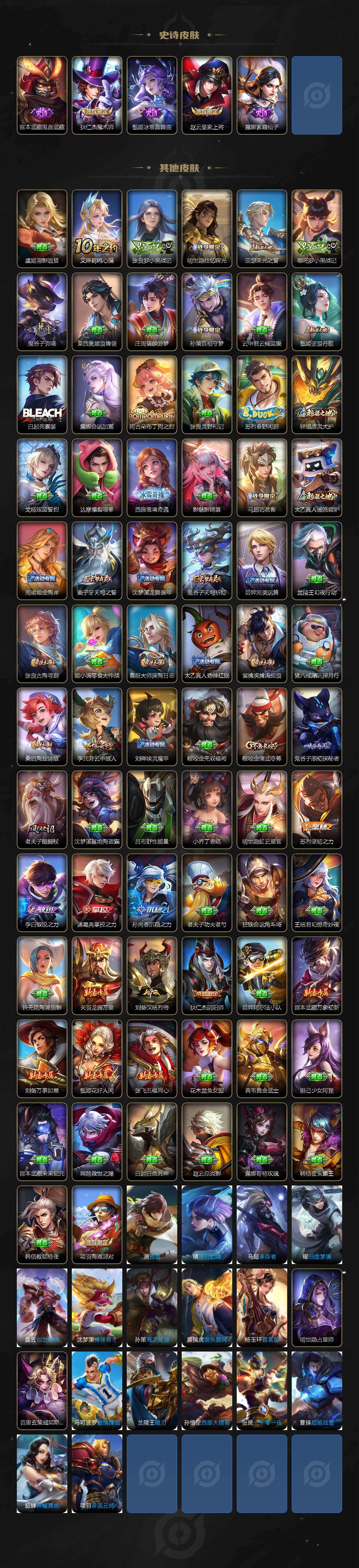 【传说皮肤】:澜愿照九州拓,典韦战鼓燎原,澜逐花归海,达摩黄金狮子座,花木兰冠军飞将,宫本武藏地狱之眼,孙悟空地狱火,狄仁杰超时空战士