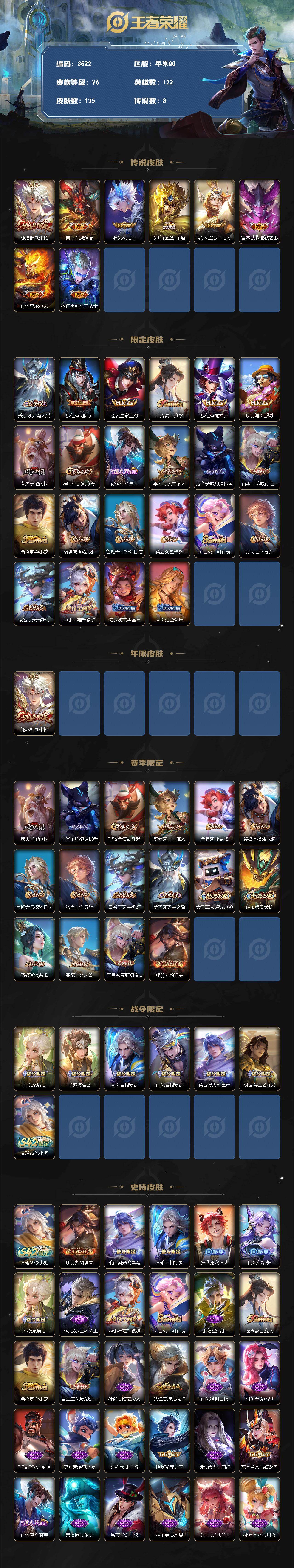 苹果Q-V6-最强王者段位-122英雄-135皮肤-8传说-34史诗