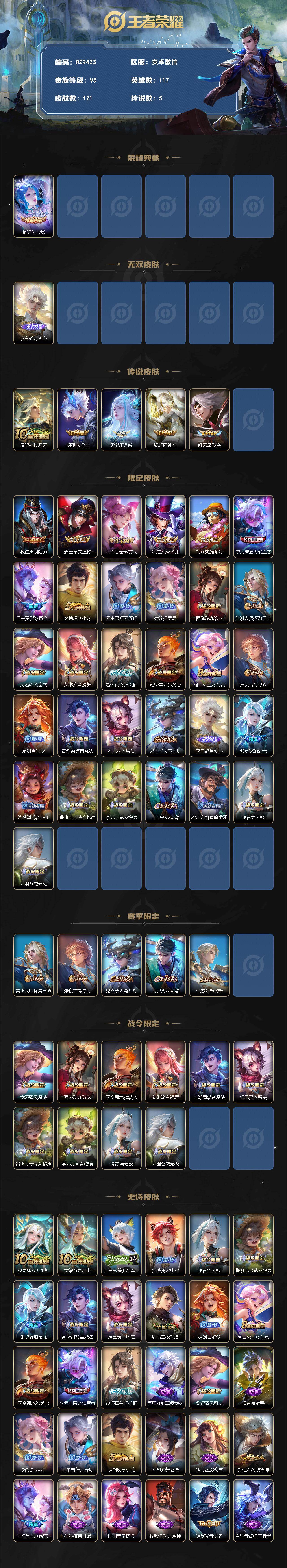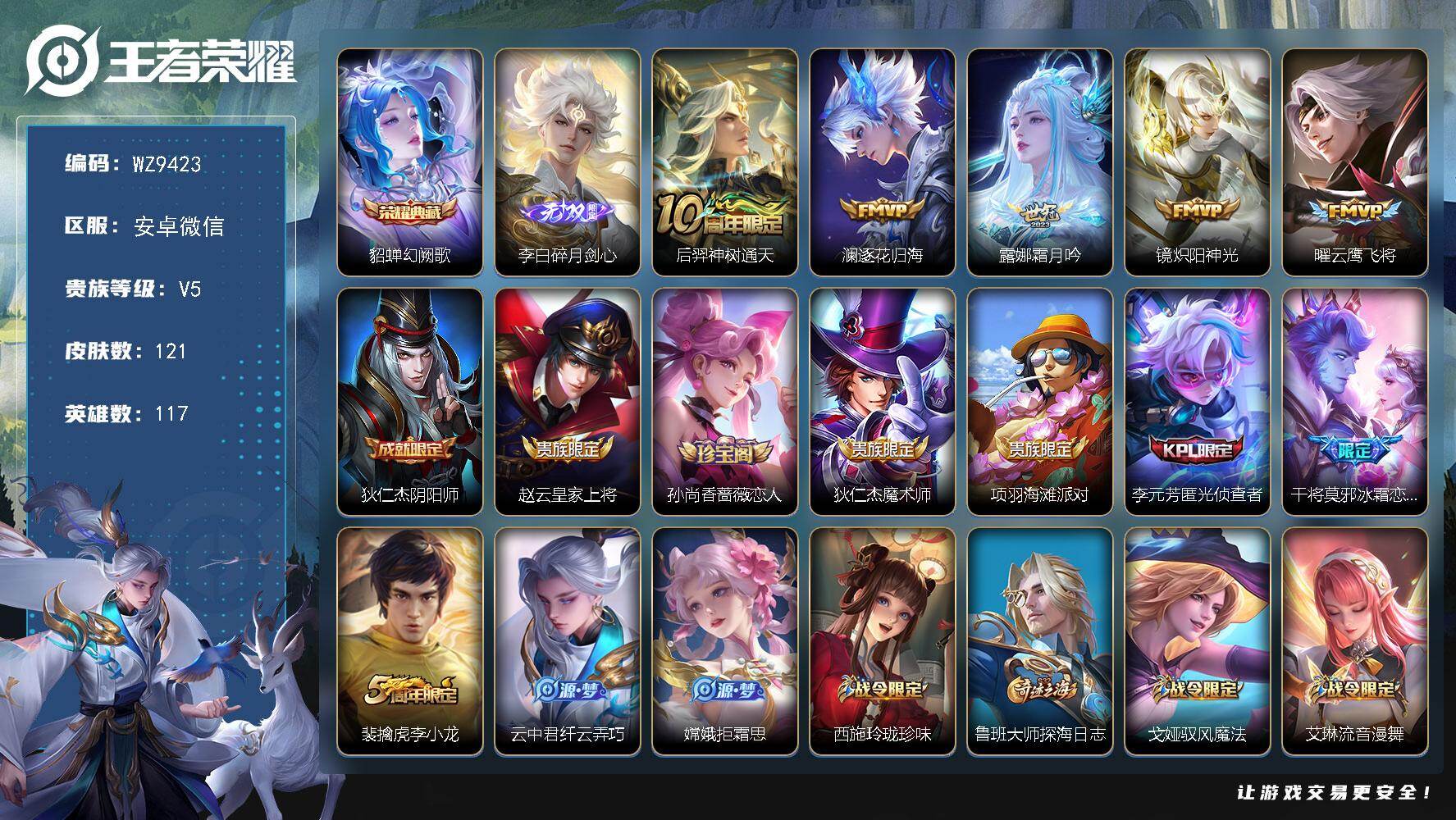 安卓WX-V5-永恒钻石III段位-117英雄-121皮肤-1典藏皮肤-1无双-5传说-46史诗