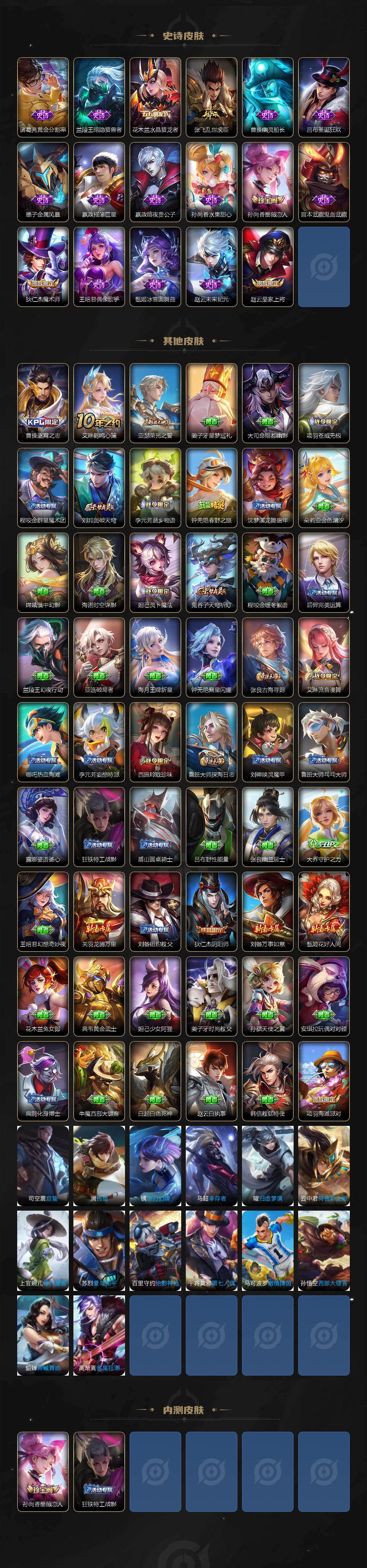 【限定皮肤】:狄仁杰阴阳师,赵云皇家上将,孙尚香蔷薇恋人,狄仁杰魔术师,项羽海滩派对,李元芳匿光侦查者,干将莫邪冰霜恋舞曲,裴擒虎李小龙,