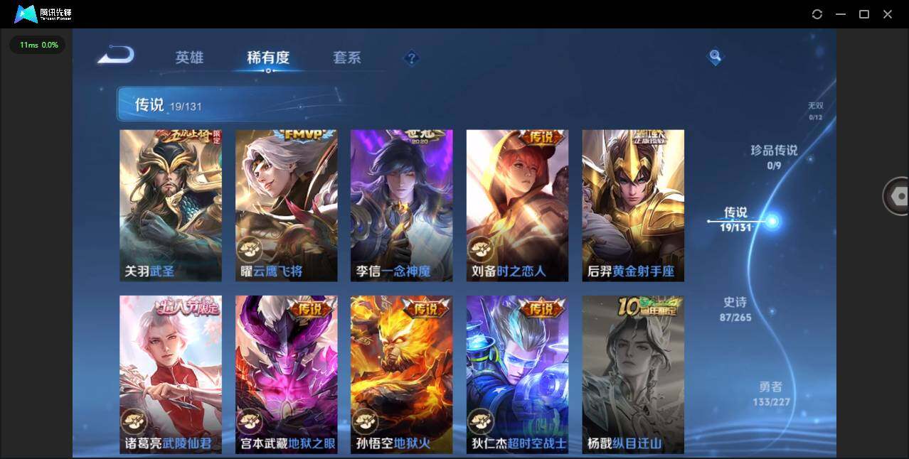 实名: 可修改 贵族等级: V8 英雄数: 127 皮肤数: 297 荣耀水晶: 天鹅之梦,九霄神辉 星传说: 幽冥之眼 传说皮: 黄金射手座,云鹰飞将,炽阳神光,一念神魔,地狱火,地狱之眼,时之恋人-刘备,超时空战士-狄仁杰,幻光神枪,神树通天 限定皮: 李小龙,梁祝,龙胆,白鹤梁神女,武圣,烈魂