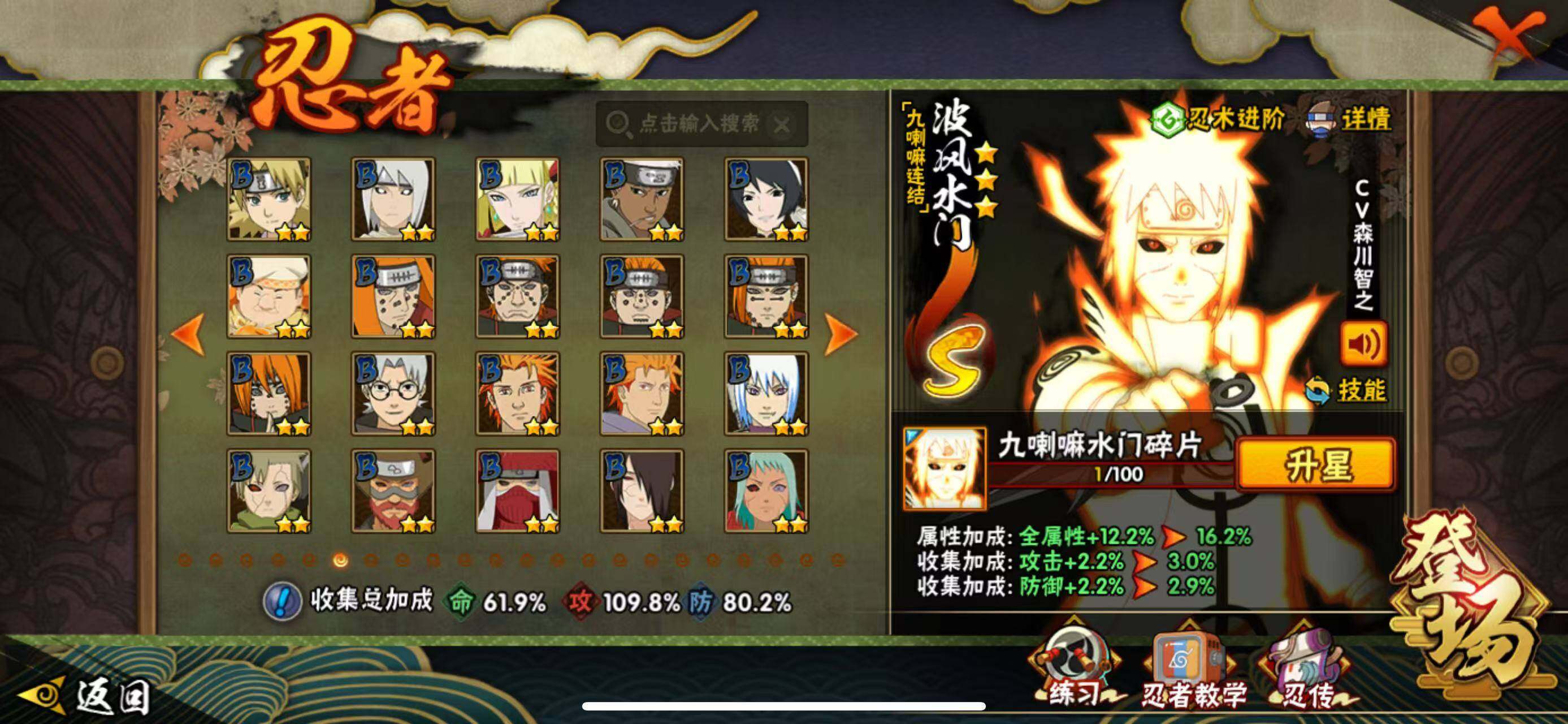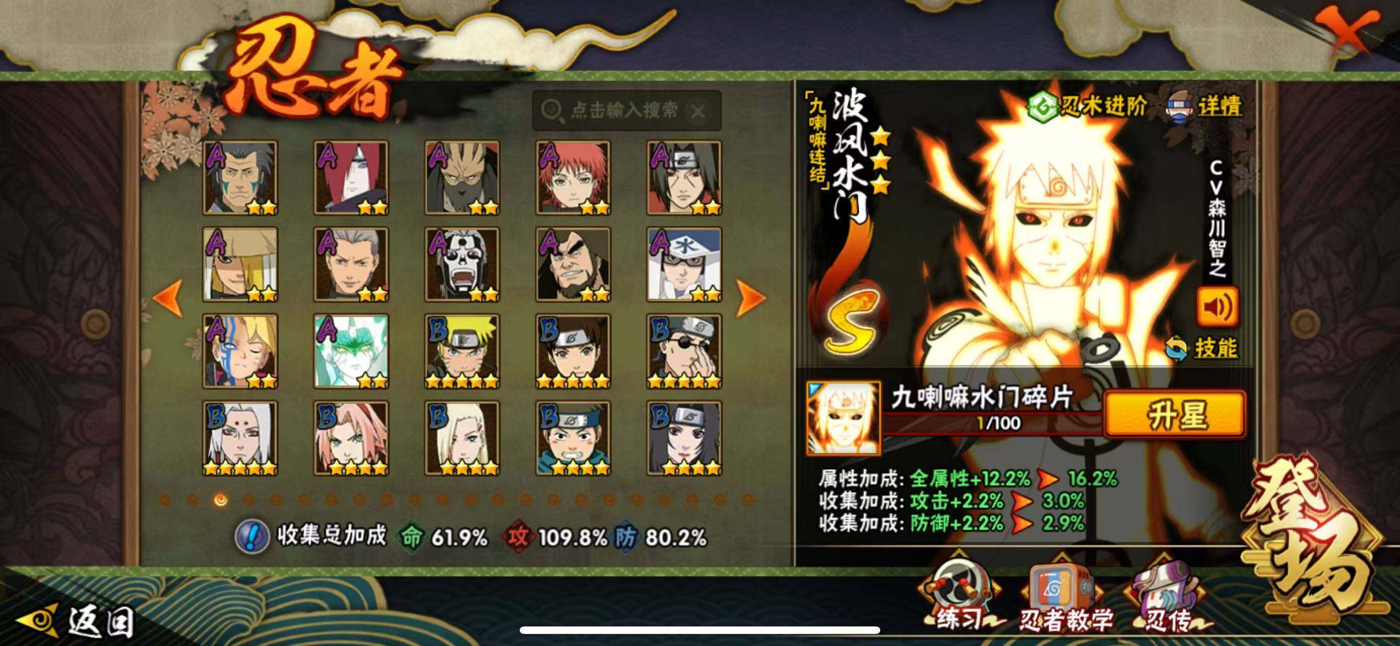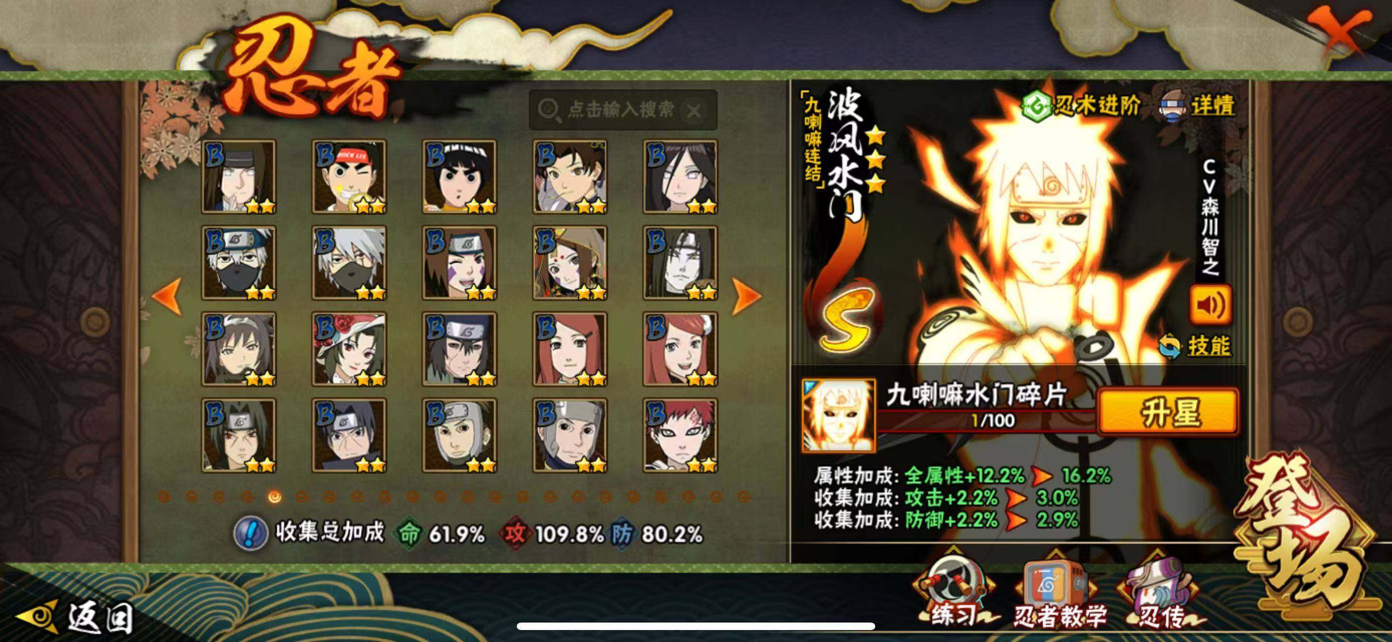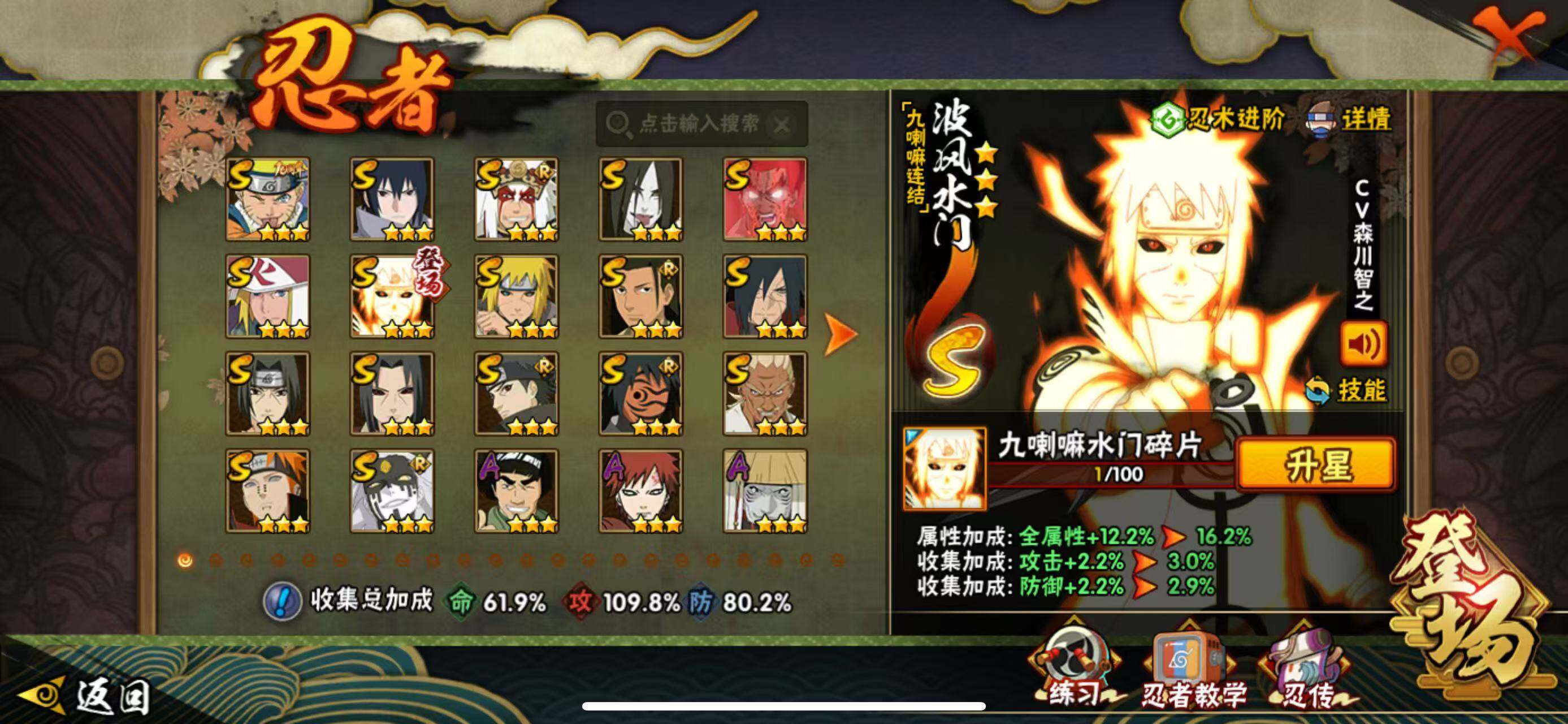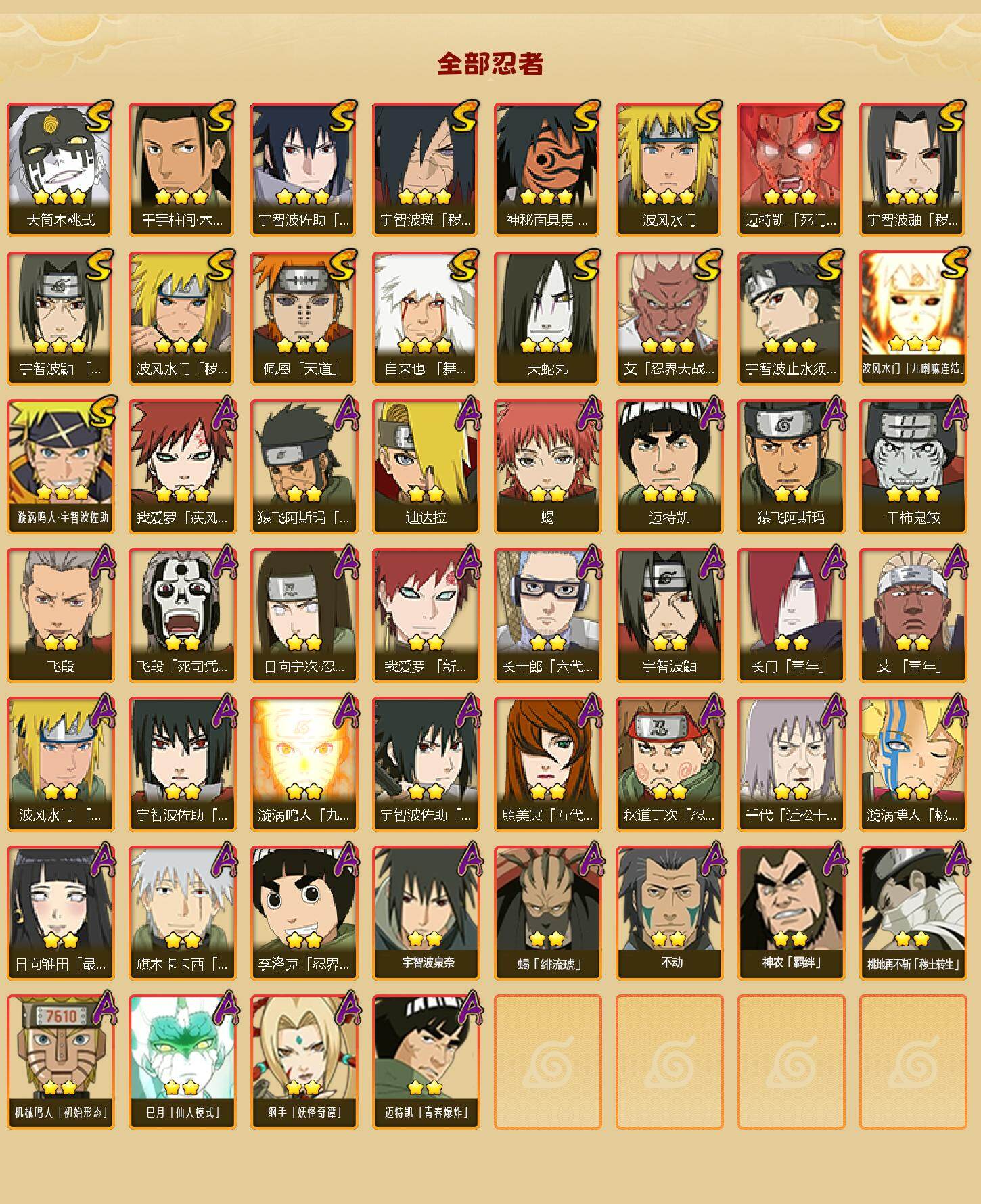 【S级忍者】:波风水门「秽土转生」(3星),宇智波鼬「秽土转生」(3星),宇智波斑「秽土转生·解」(3星),艾「忍界大战」(3星),宇智波鼬「须佐能乎」(3星),宇智波止水「须佐能乎」(3星),千手柱间「木叶创立」(3星),自来也「舞之豪杰」(3星),大蛇丸(3星),波风水门(3星),神秘面具男「红夜之刃」(3星),迈特凯「死门」(3星),佩恩「天道」