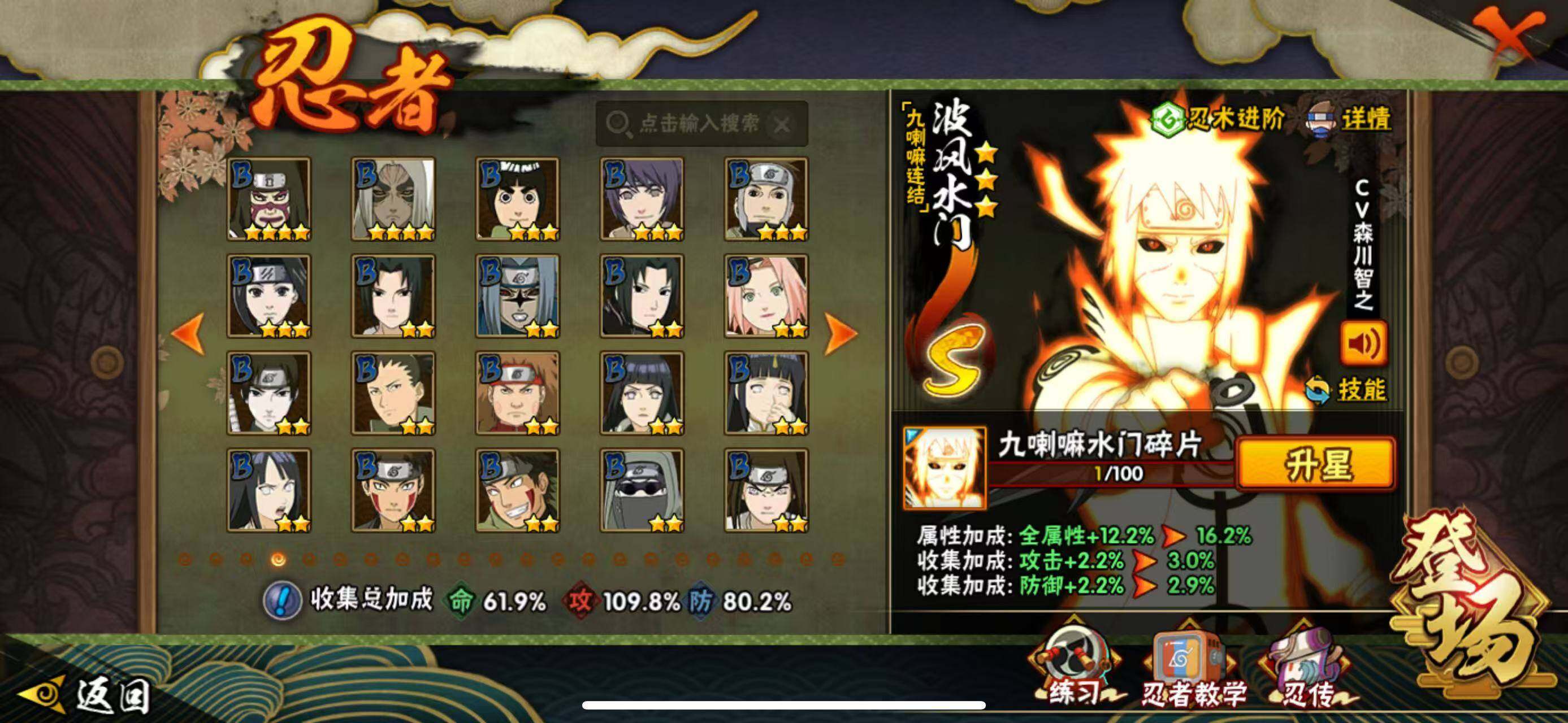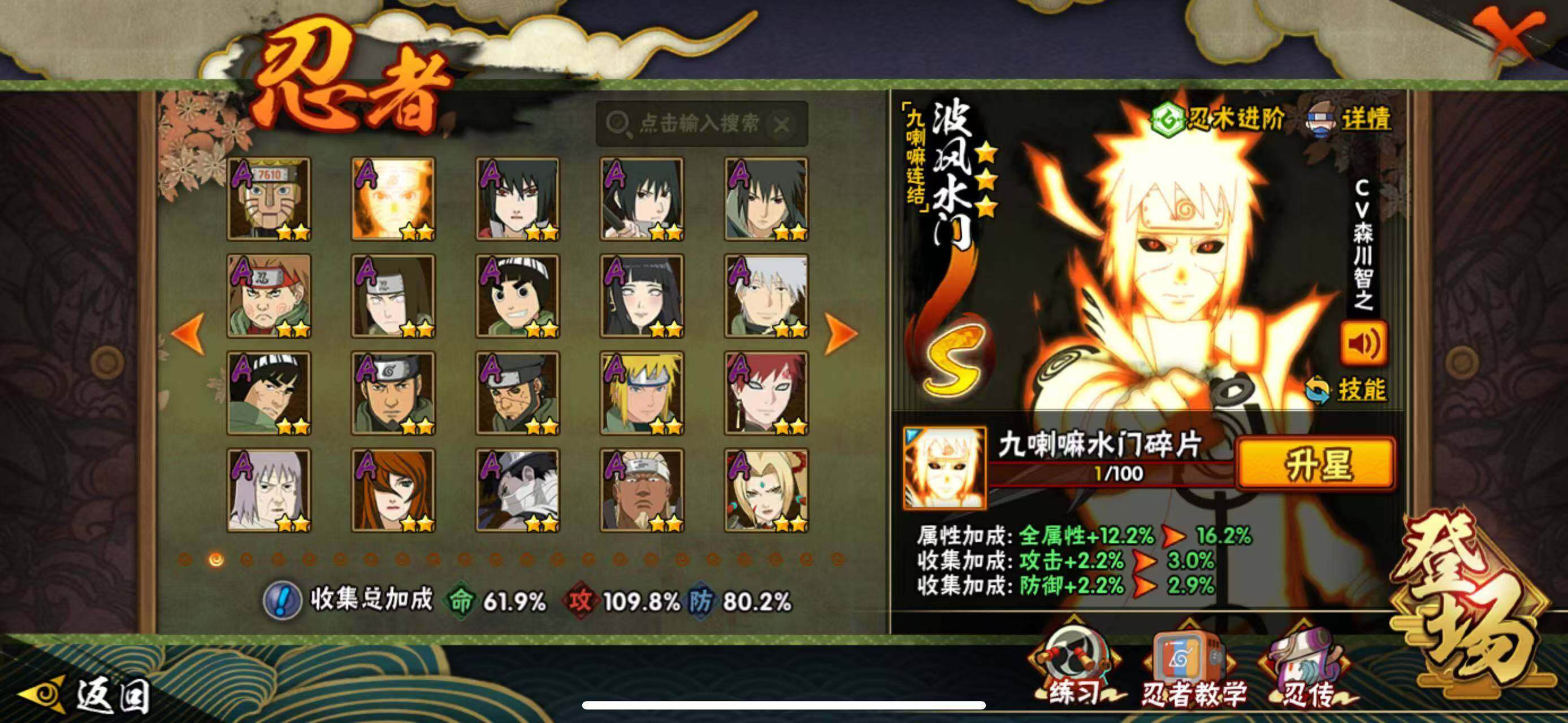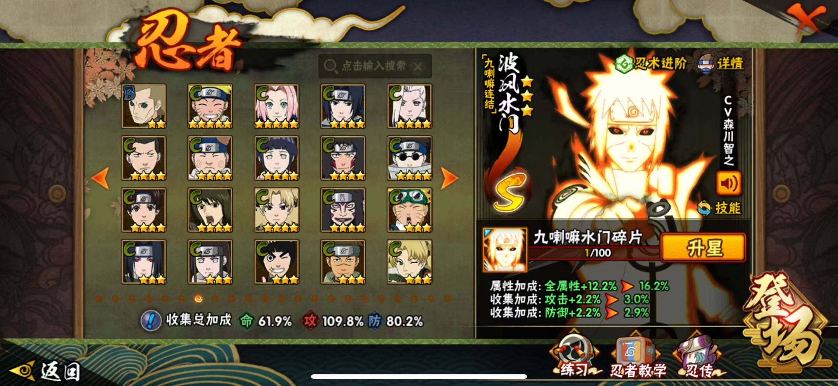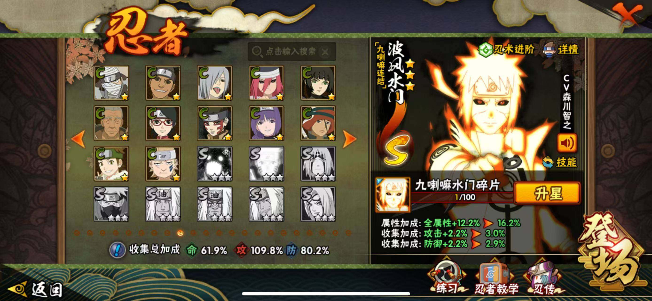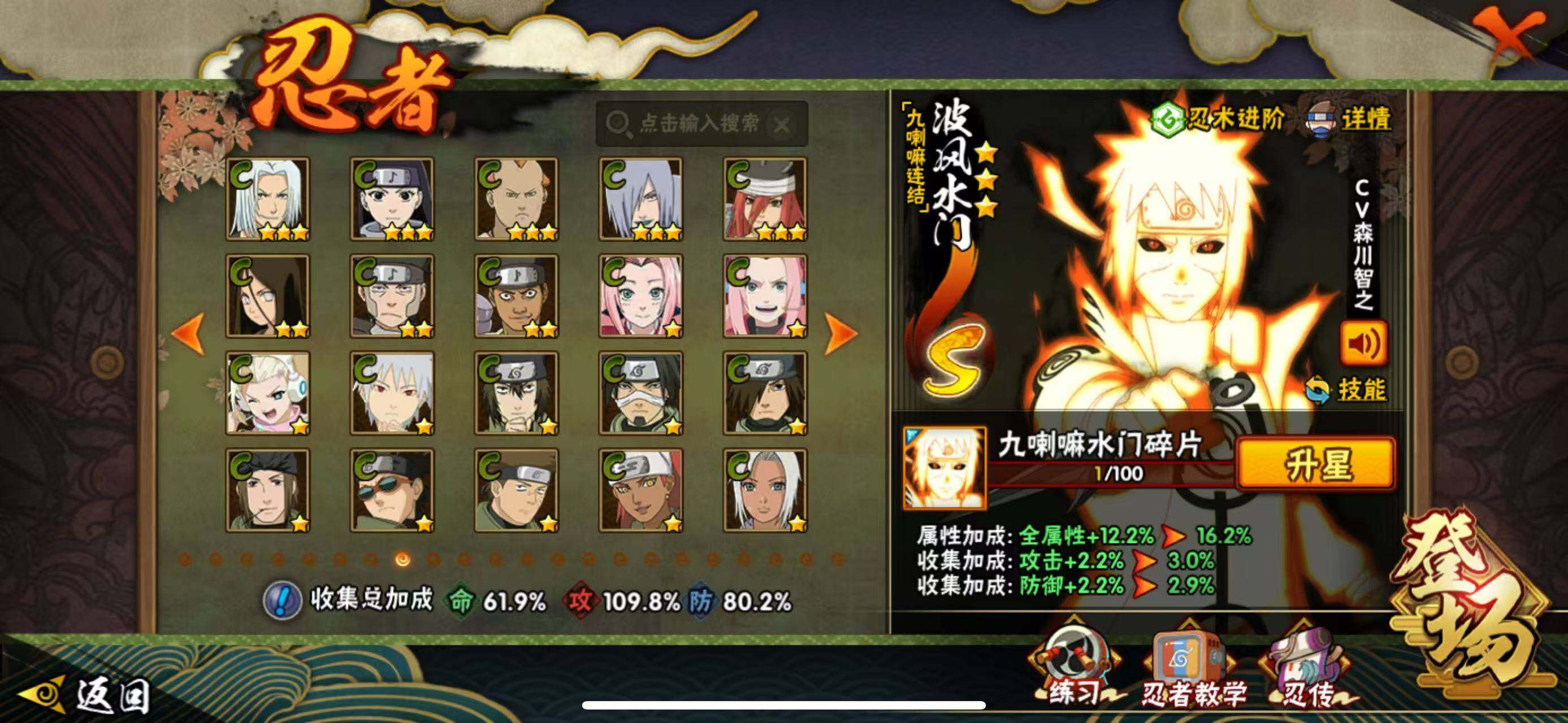 【S级忍者】:波风水门「秽土转生」(3星),宇智波鼬「秽土转生」(3星),宇智波斑「秽土转生·解」(3星),艾「忍界大战」(3星),宇智波鼬「须佐能乎」(3星),宇智波止水「须佐能乎」(3星),千手柱间「木叶创立」(3星),自来也「舞之豪杰」(3星),大蛇丸(3星),波风水门(3星),神秘面具男「红夜之刃」(3星),迈特凯「死门」(3星),佩恩「天道」