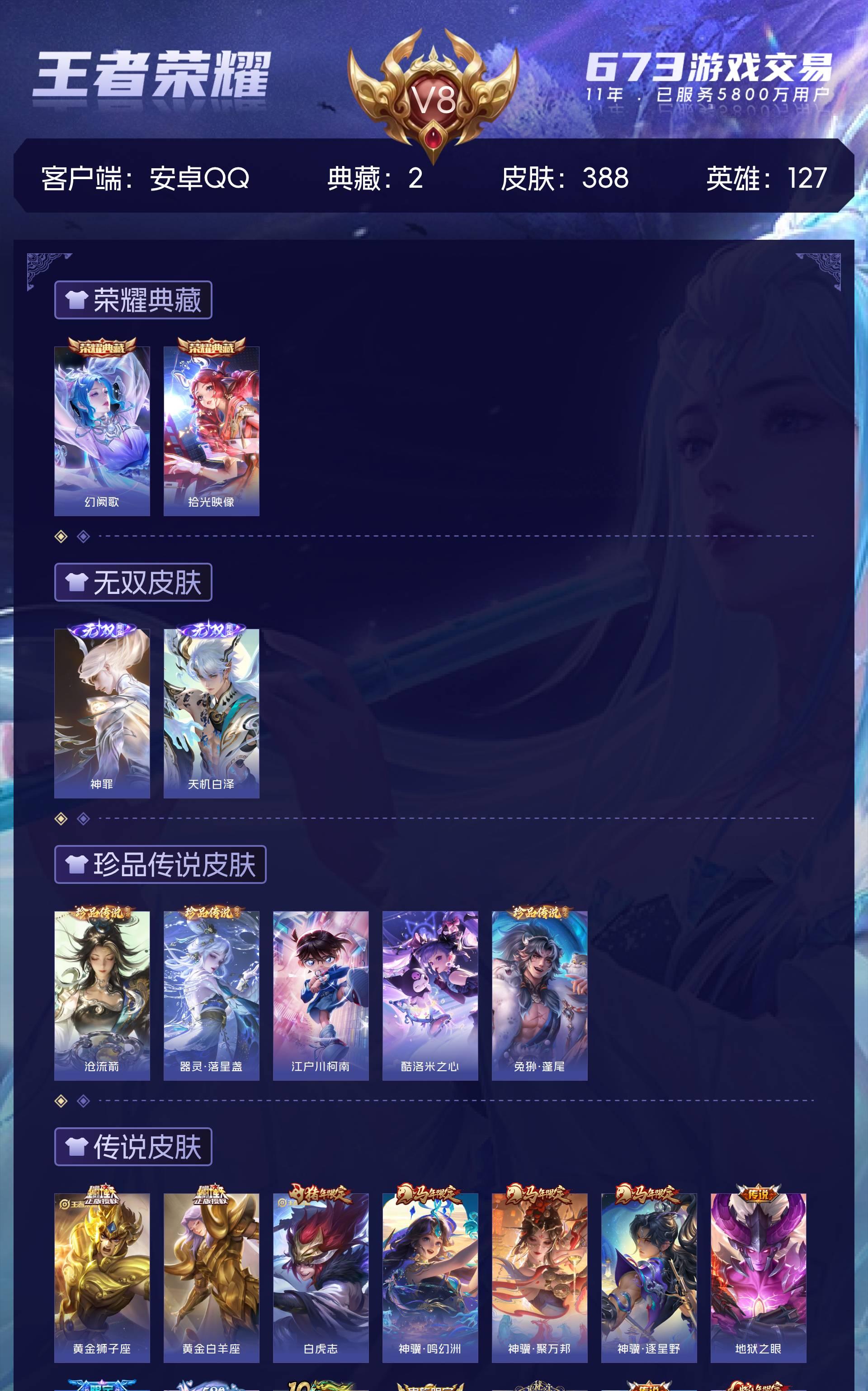 安卓QQ/传奇王者/388皮肤/127英雄/2典藏/0珍品无双/2无双/5珍品传说/23传说/121