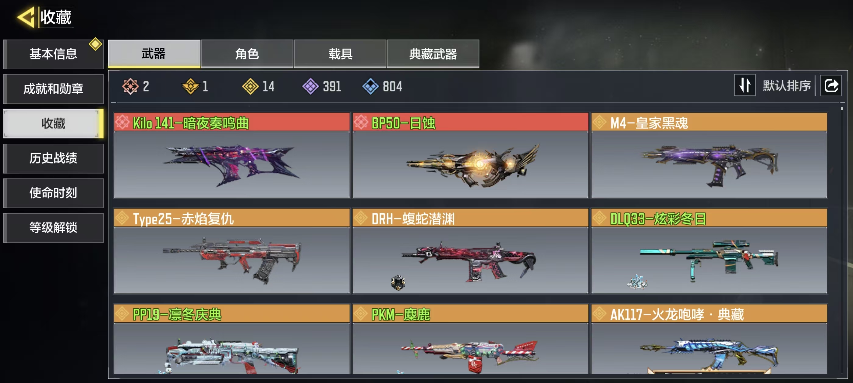 【传说武器】DRH-蝮蛇潜渊,电棍-永恒炽热,AK47-火箭炮,CR56-回音律动,飞翼浮游炮-V高达,RPD-一路悠扬,PKM-麋鹿,M4-皇家黑魂,SA80-狂暴冲锋,Type25-赤焰复仇,DLQ33-炫彩冬日,PP19-凛冬庆典,Grau 5.56-升龙寻道,