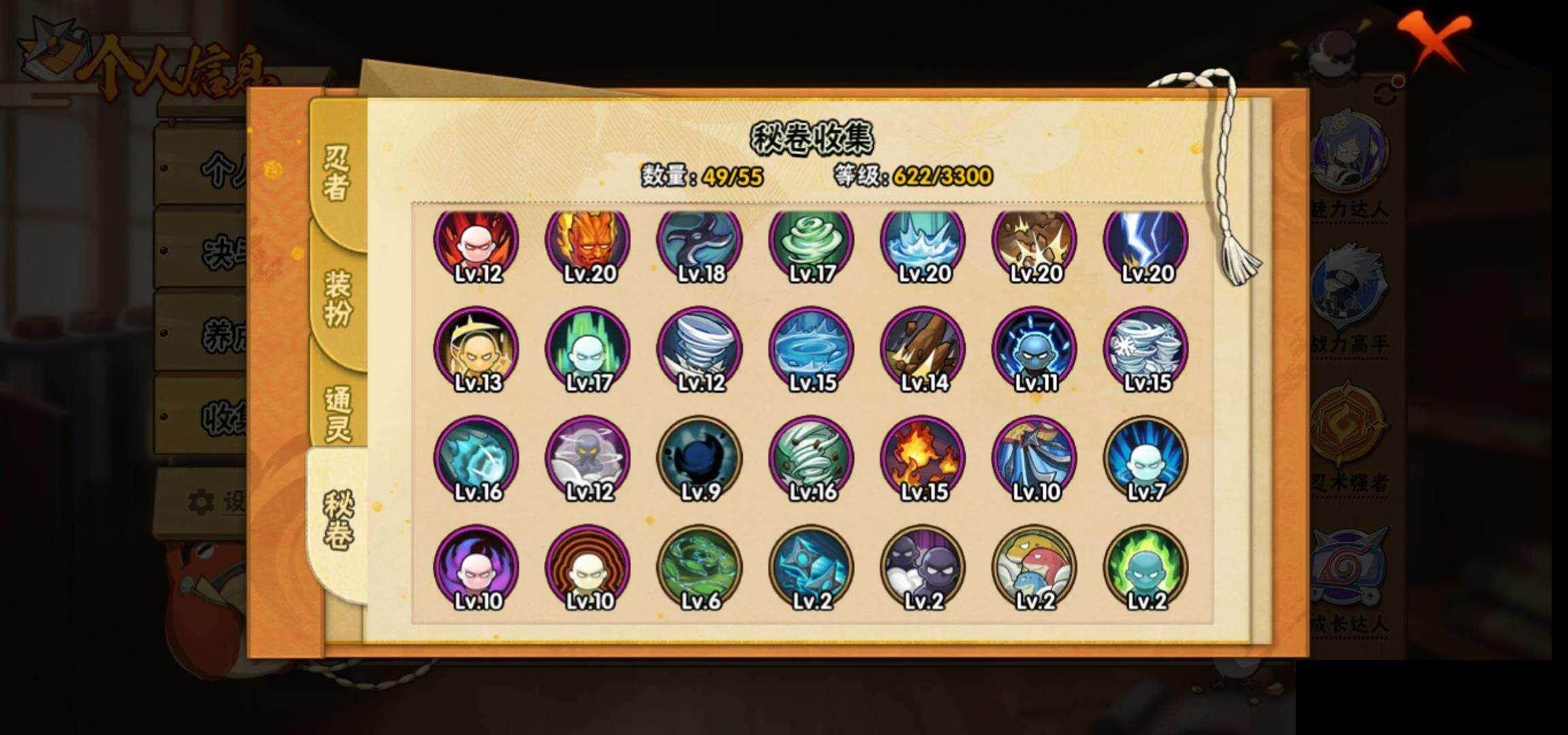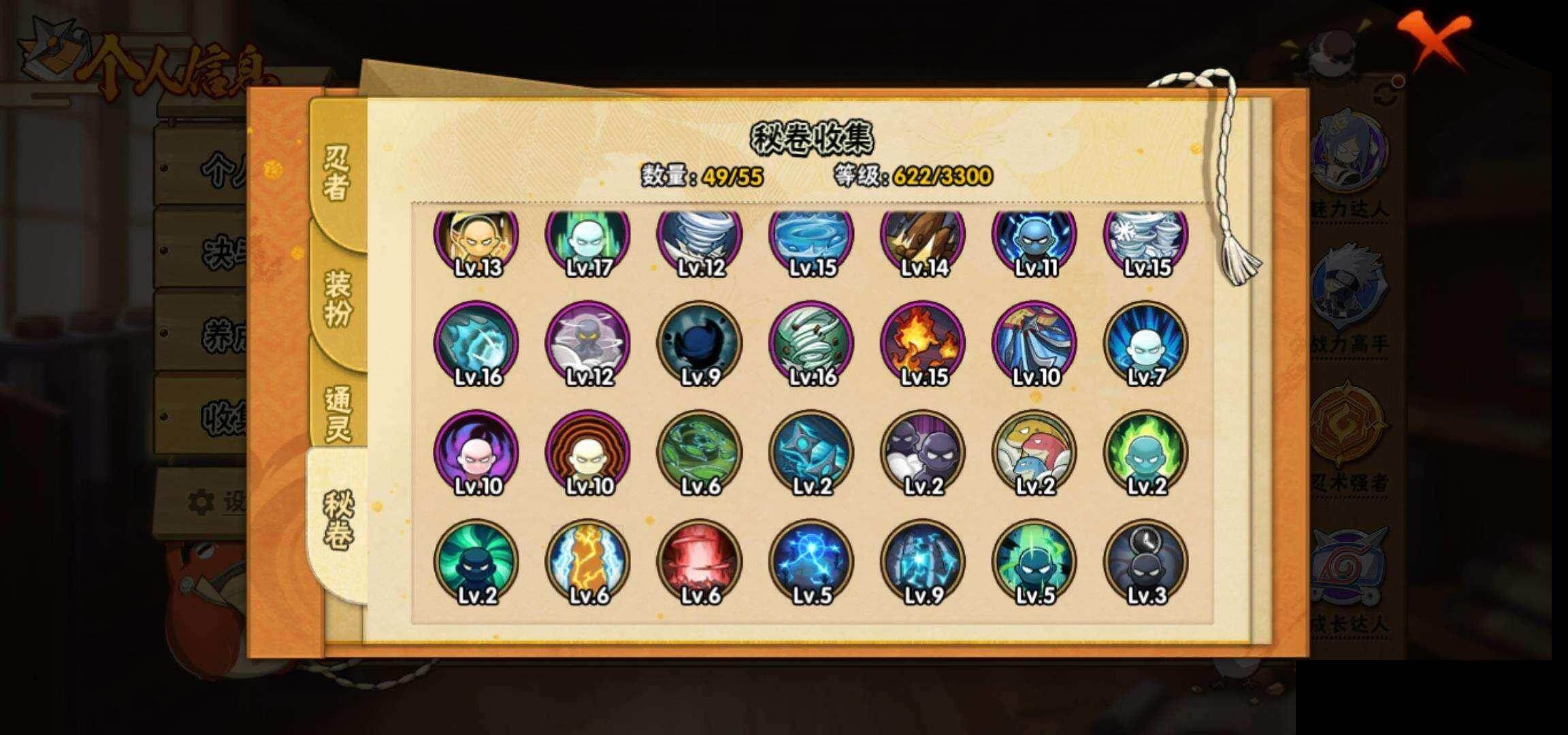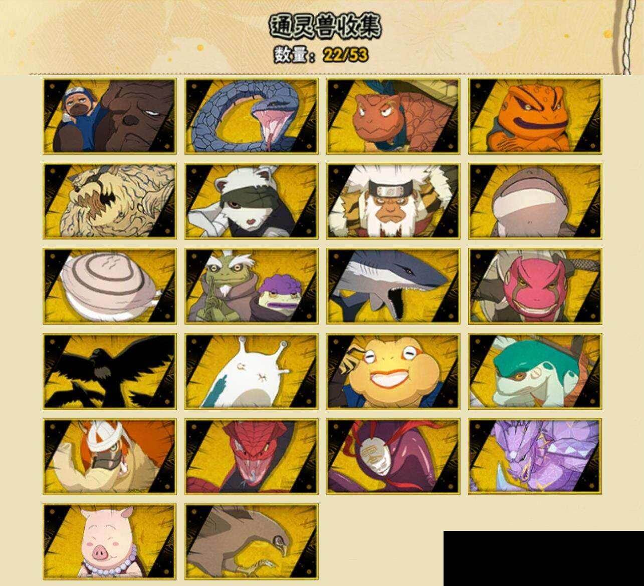 【永久通灵兽】忍犬,蓝蛇,忍龟,蛤蟆吉,砂之守鹤,镰鼬,猿魔,山椒鱼,蜃,蛤蟆仙人,鲛鲨,蛤蟆健,乌鸦,蛞蝓,蛤蟆龙,蛤蟆广,梦貘,辛牙,零尾,威装须佐十周年,豚豚,鹰