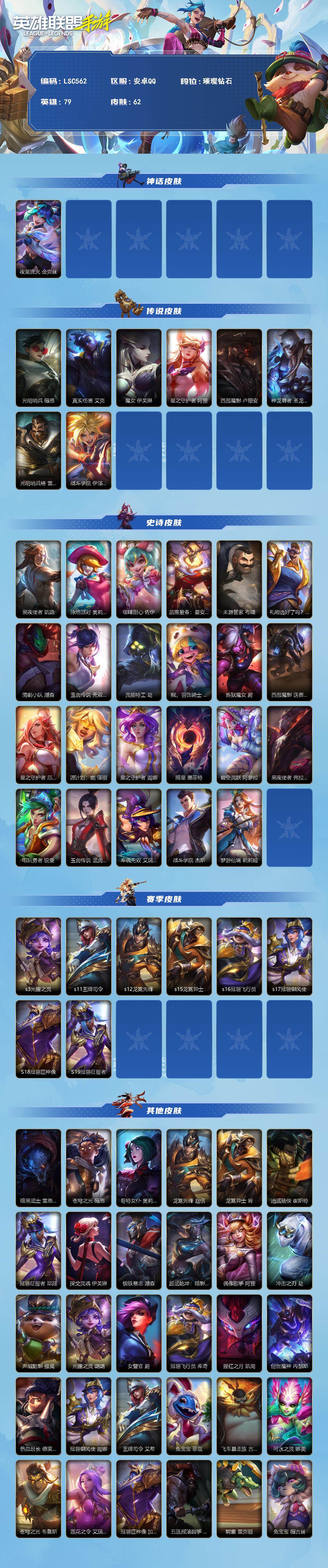 【LSC562】79英雄/62皮肤/璀璨钻石/夜星流火 金克丝/光明哨兵 薇恩/真实伤害 艾克/魔女 伊芙琳/星之守护者 阿狸/西部魔影 卢锡安/神龙尊者 圣龙 李青/光明哨兵 格雷福斯/战斗学院 伊泽瑞尔/黑夜使者 凯隐/泳池派对 奥莉安娜/咖啡甜心 佐伊/蕊雪盈春:晏安 赫卡里姆/末路管家 布隆/礼物选好了吗? 布隆/清剿小队 潘森/玉剑传说 无双 菲奥娜/灵能特工 劫/我,羽饰骑士 崔丝塔娜/炼狱魔女 蔚/西部魔影 送葬人 图奇/星之守护者 厄运小姐/源计划:燃 泽丽/星之守护者 迦娜/暗