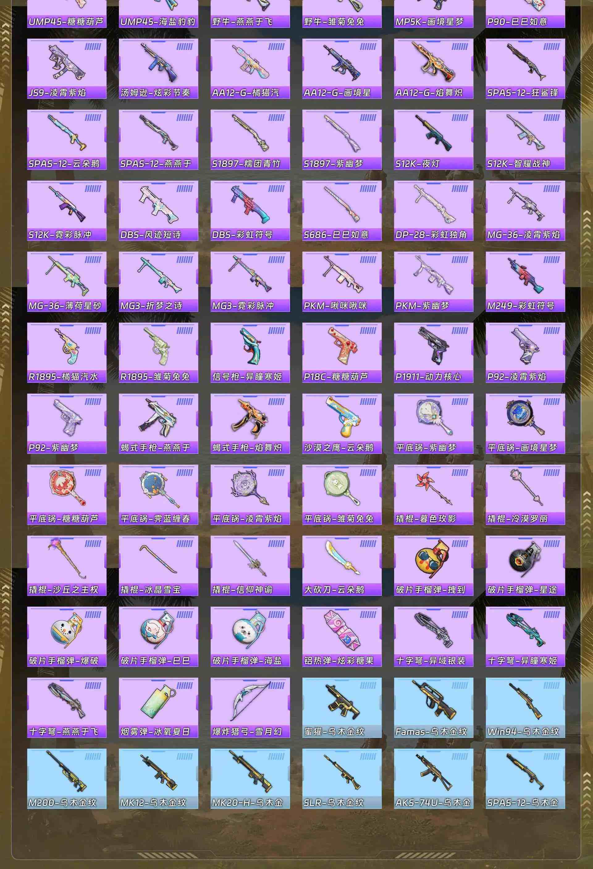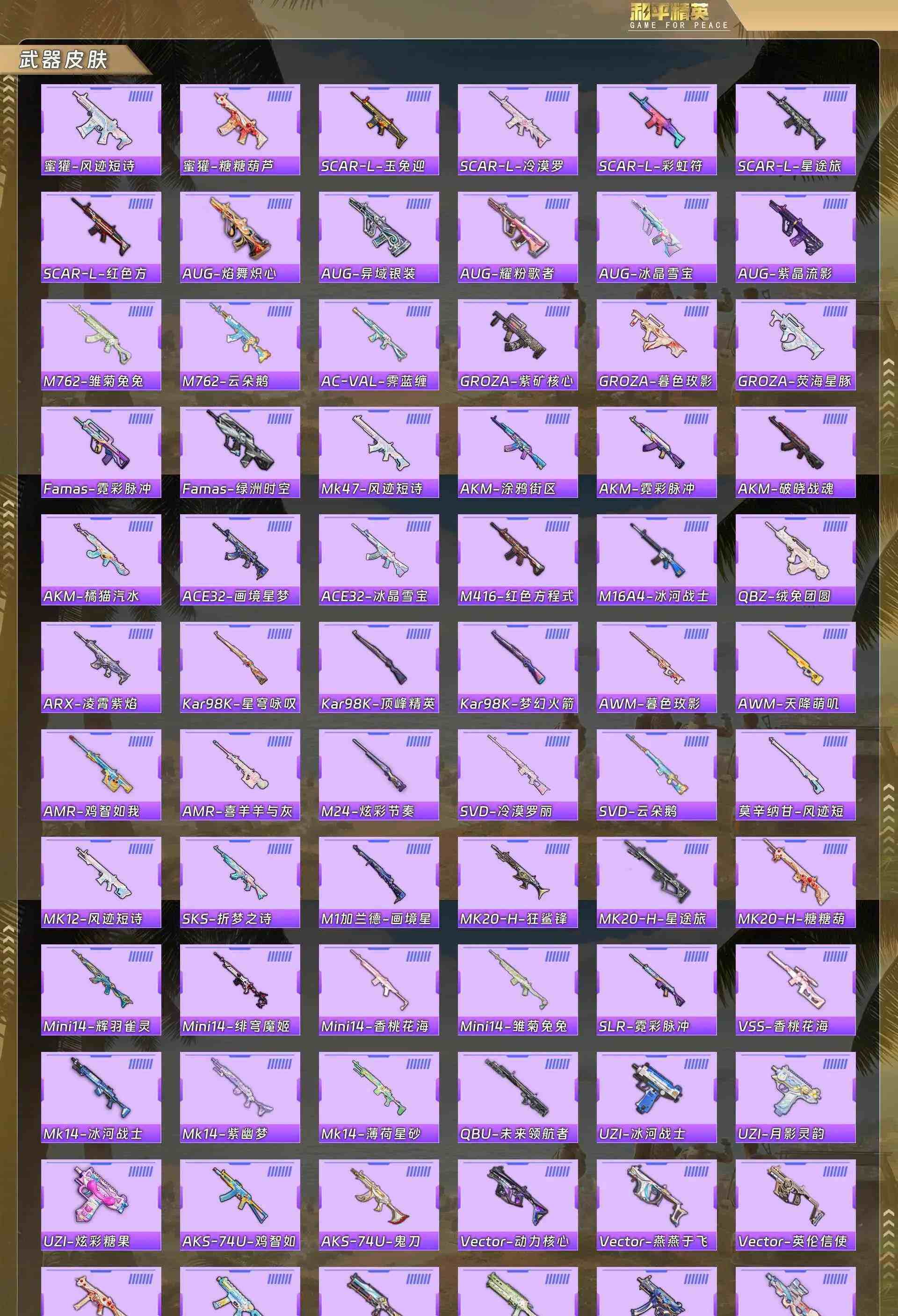 【粉色枪皮等级】:AKM-暮色玫影(三级),Kar98K-巳巳如意(五级),AMR-智耀战神(七级),DP-28-豹影疾电(五级)