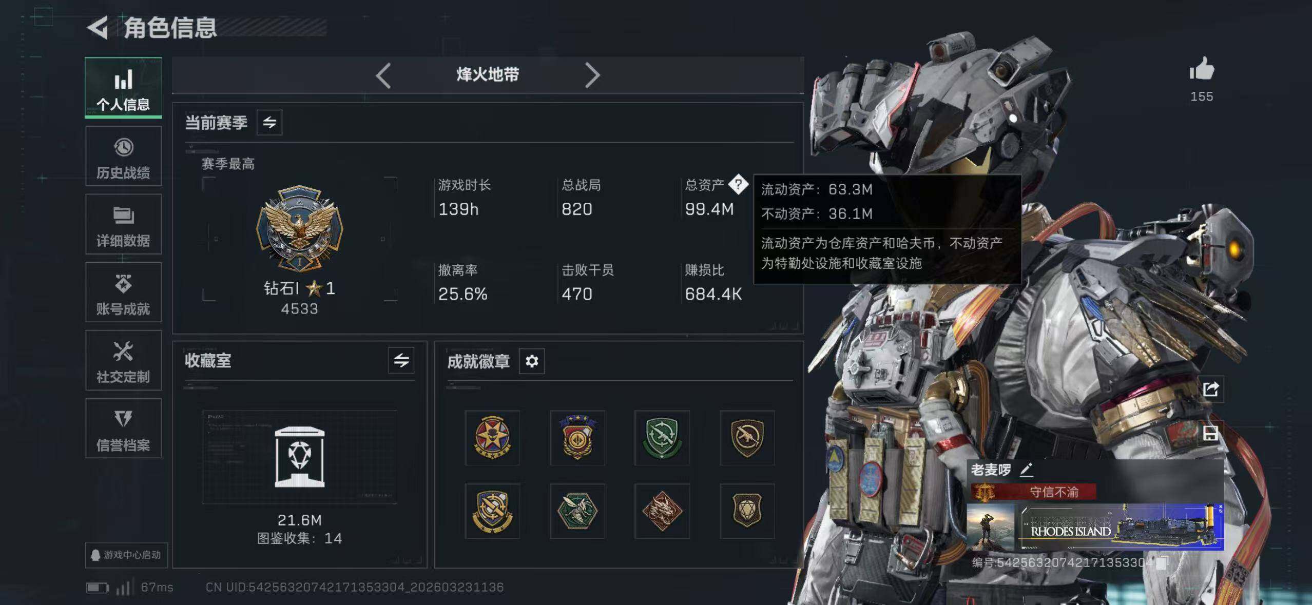 【SJ1513】98m总资产-1063k哈夫币-60烽火等级-钻石-21战场等