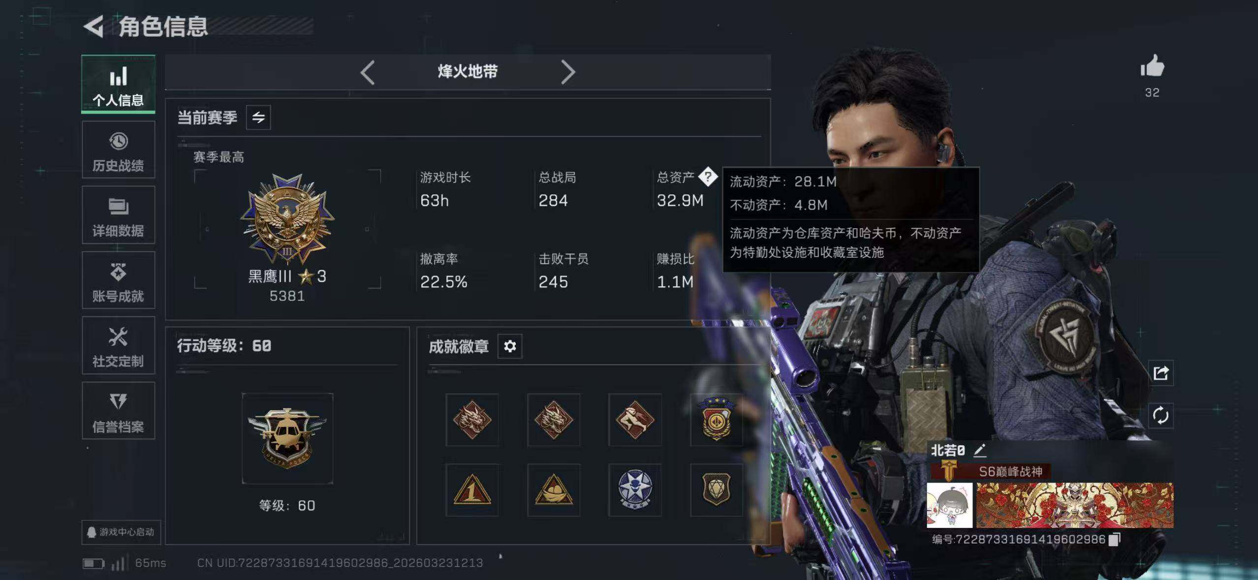 【SJ1514】30m总资产-4411k哈夫币-60烽火等级-黑鹰-31战场等级-列兵