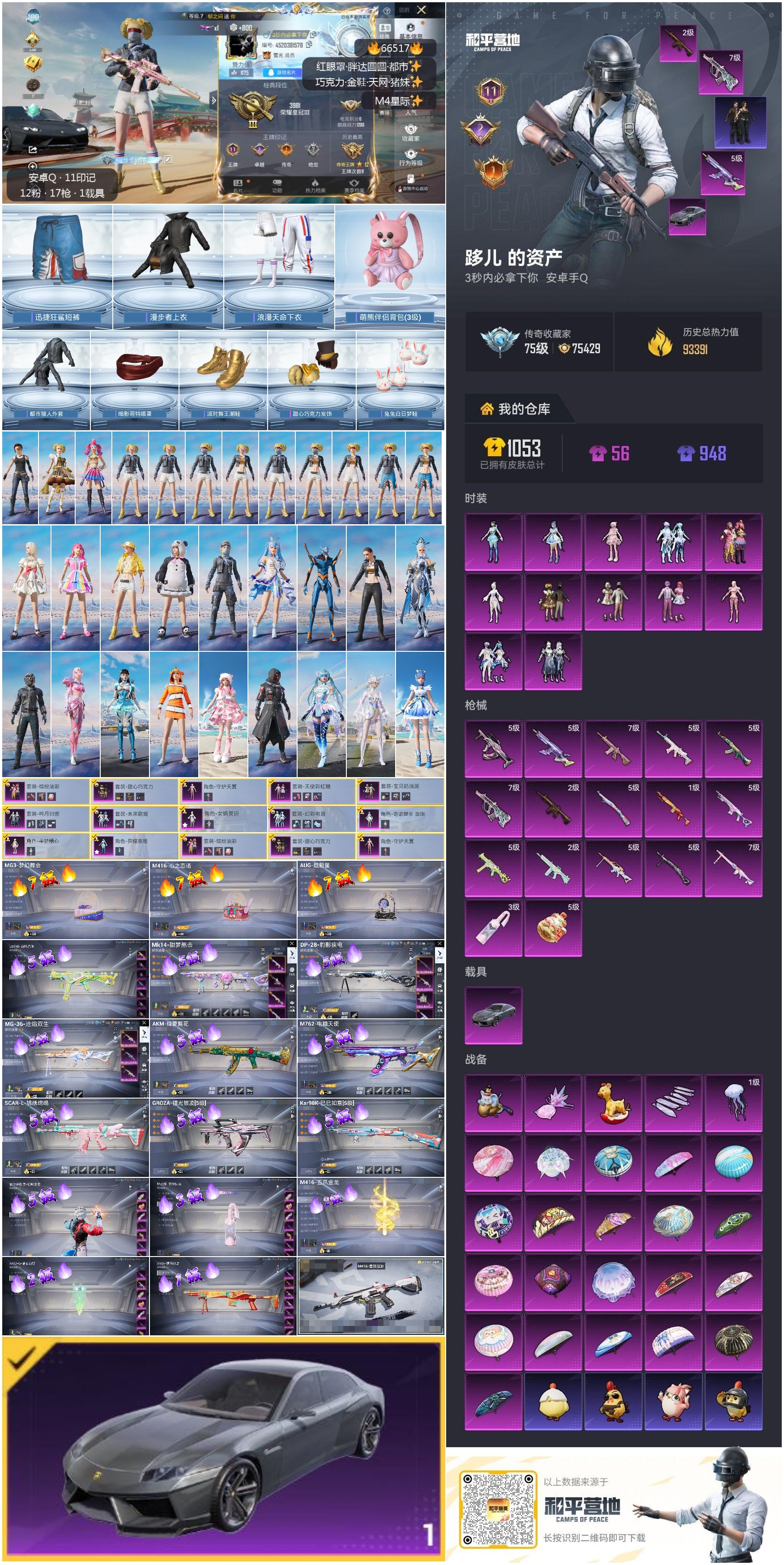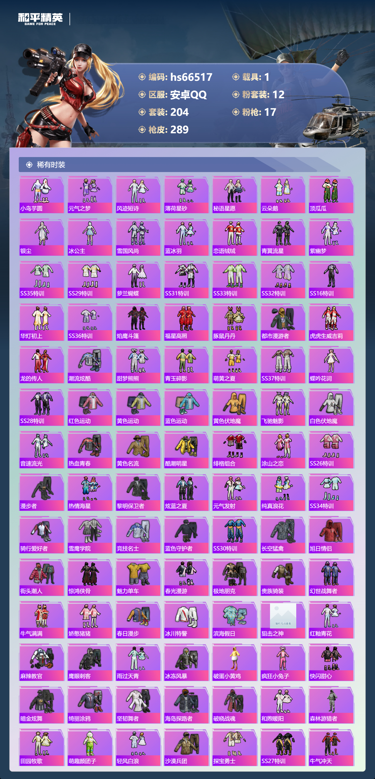 hs66517 安卓手Q-11王牌印记-12粉装-17特效枪-1载具-93391热力值-204套装-289枪皮-2卓越印记-1传奇印记