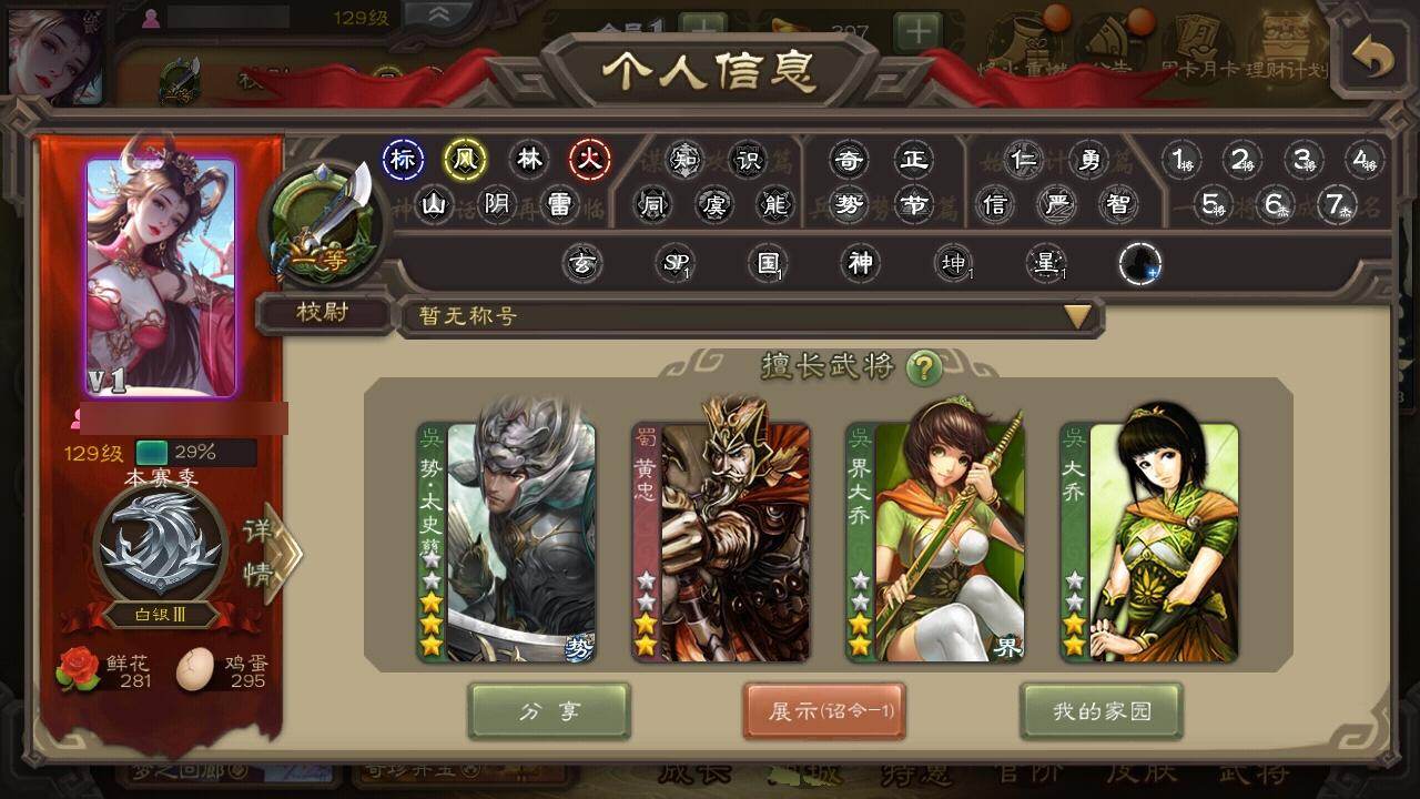 官阶:先锋将军;VIP等级:VIP1;史诗武将数量:2;动态皮肤数量:1;武将