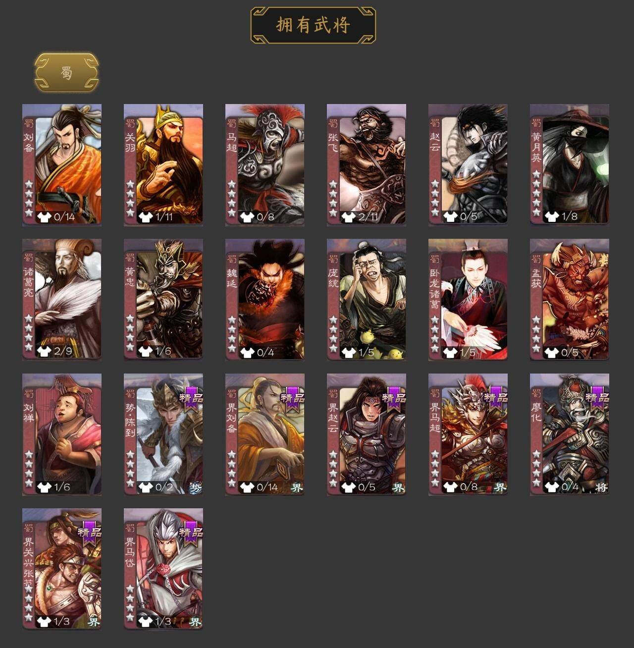 蒋济,SP曹仁,曹冲,界曹操,界司马懿,界夏侯惇,李典,曹真,界曹植,势陈到,廖化,界马岱,界关兴张苞,界刘备,界赵云,界马超,虞翻,界甘宁,界周瑜,谋韩当,界袁术,伏皇后,华雄,袁术,荀谌