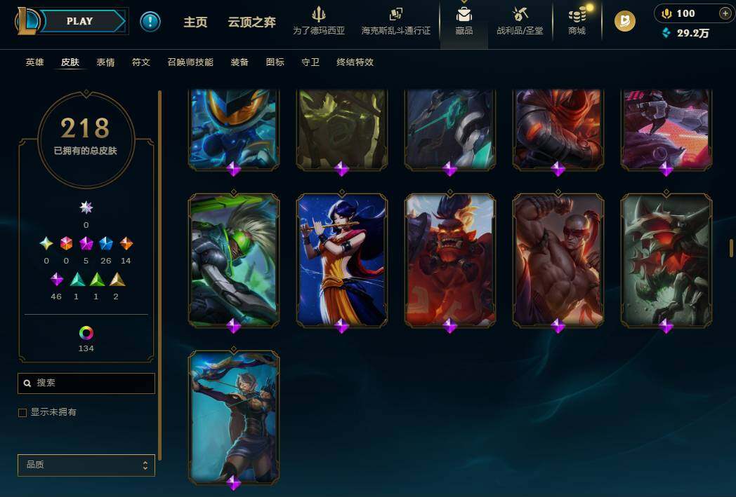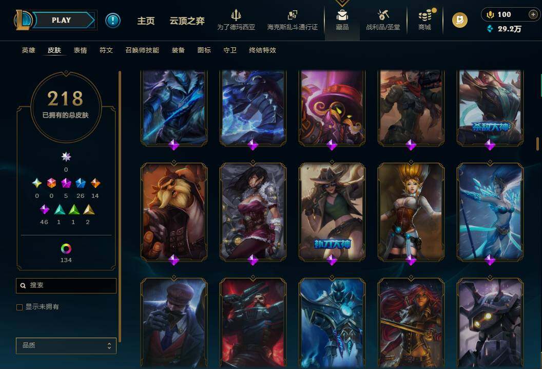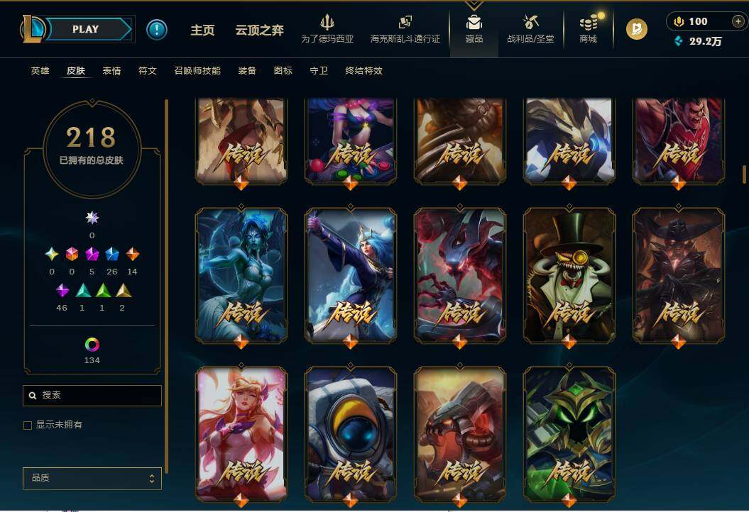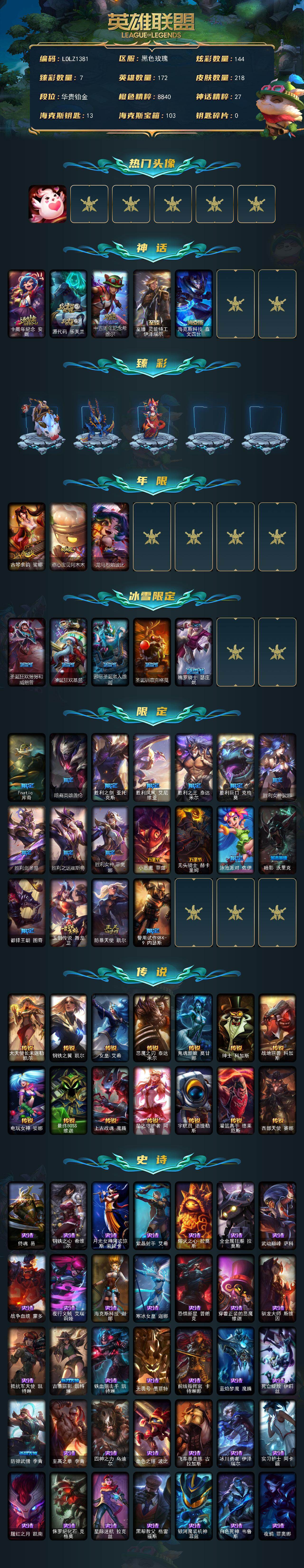 172英雄/218皮肤/5神话/27限定/7臻彩/144炫彩/14传说/46史诗/铂金/