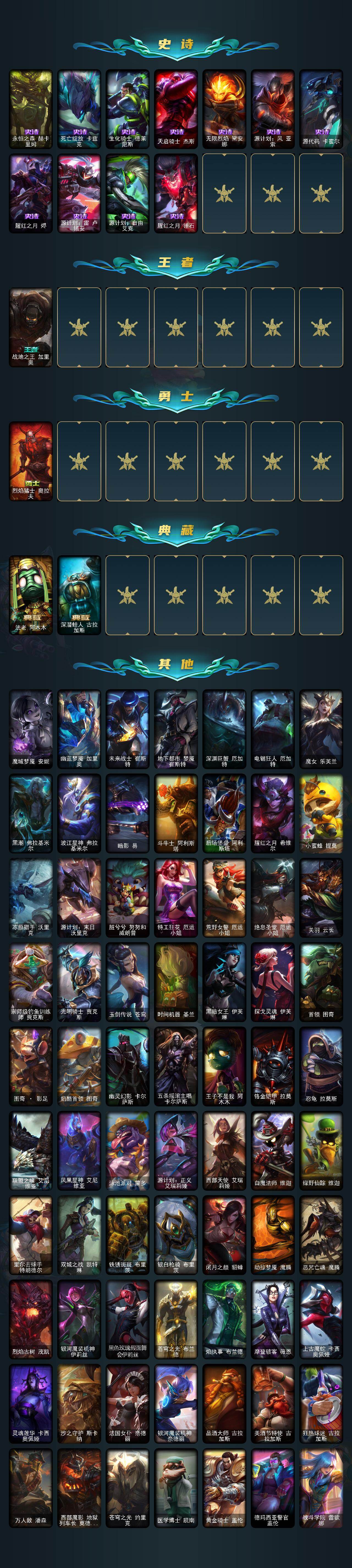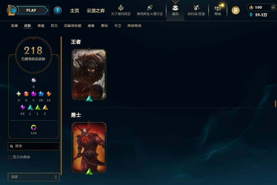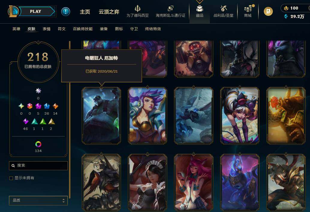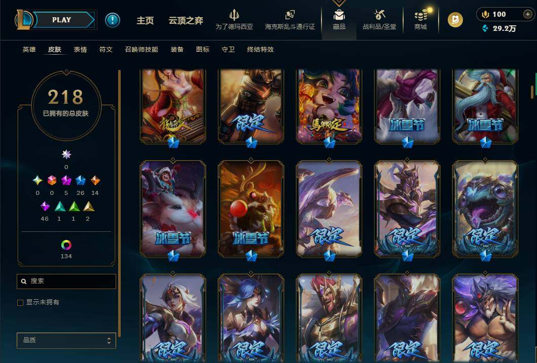 172英雄/218皮肤/5神话/27限定/7臻彩/144炫彩/14传说/46史诗/铂金/
