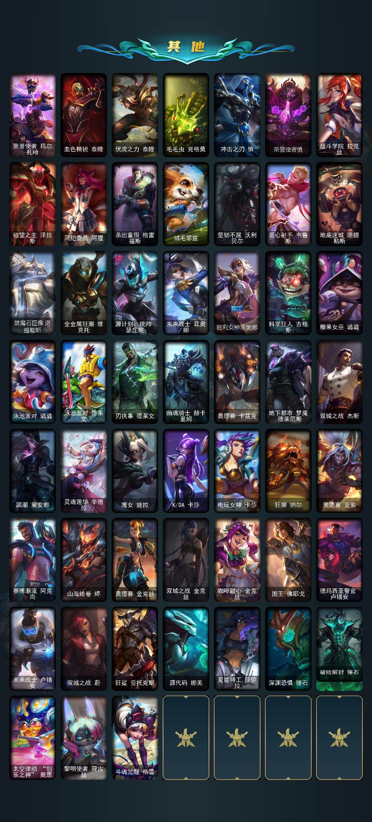 【LOLZ1381】172英雄/218皮肤/5神话/27限定/7臻彩/144炫彩/14传说/46史诗/铂金/爱情鸽头像/十周年纪念安妮/源代码乐芙兰/十五周年纪念希维尔/至臻灵能特工伊泽瑞尔/海克斯科技嘉文四世/无畏骑士瑟庄妮赤子初心/霸天异形卡兹克掠空魅影/灵魂莲华卡西奥佩娅流火/魔女阿卡丽虚荣/红莲之刃锐雯/西部魔影执行人卡特琳娜纯洁/古琴余韵娑娜/点心宝贝阿木木/龙马烈焰波比/圣诞狂欢努努和威朗普/圣诞狂欢基兰/邪恶圣诞老人维迦/圣诞驯鹿克格莫/魄罗骑士瑟庄妮/Fnatic库奇/暗裔英雄盖