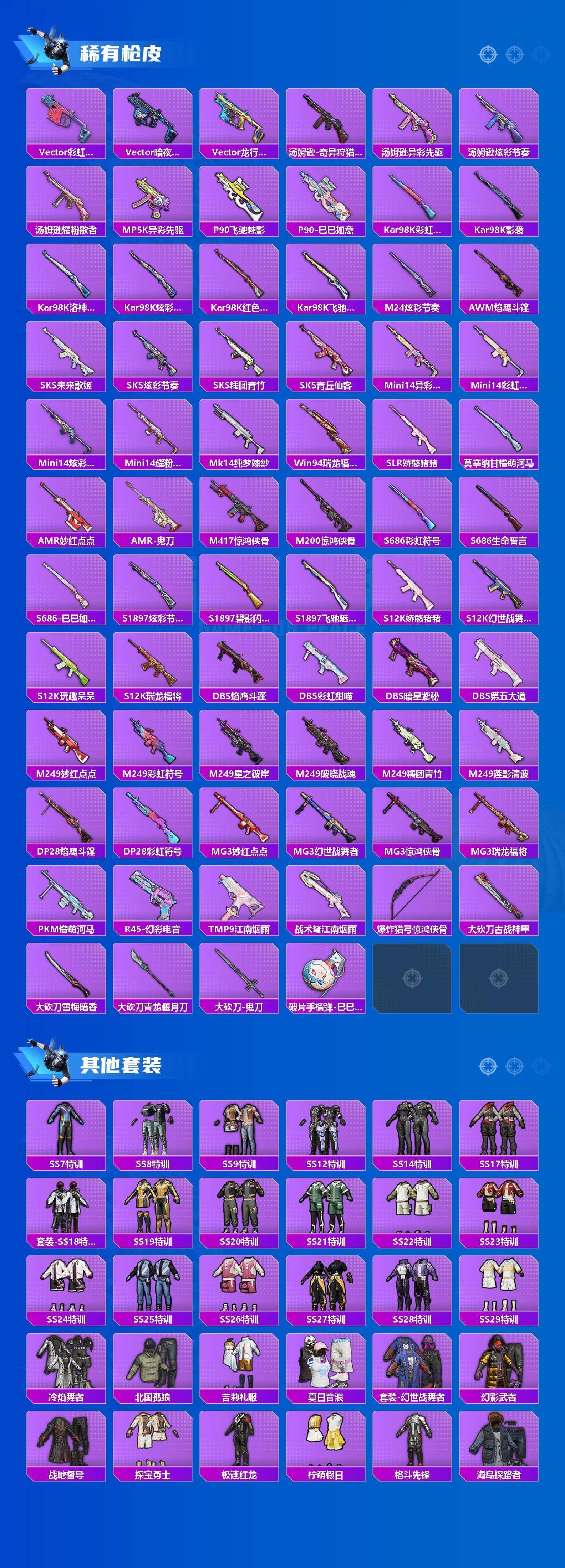 粉装4/粉枪9/载具1/珍稀飞行器130245,72267/套装144/枪皮199/热力值64912/历史最高段位:王牌印记14次/Lv:68/五级AKM-绿萝繁花/五级M416-电玩时刻/五级GROZA-镜光银凌/五级AUG-暖羊咩咩/五级UMP45-量子极限/五级Kar98K-巳巳如意/三级M24-莲影清波/七级Mk14-精灵梦叶罗丽/六级PKM-江南烟雨/军刀雅典娜/忠义严颜/套装-龟仙人/角色-8号机/大砍刀-青龙偃月刀/撬棍-龙胆亮银枪/星之彼岸/飓风飞鹰/烟云彩露/角色-绯穹魔姬/照