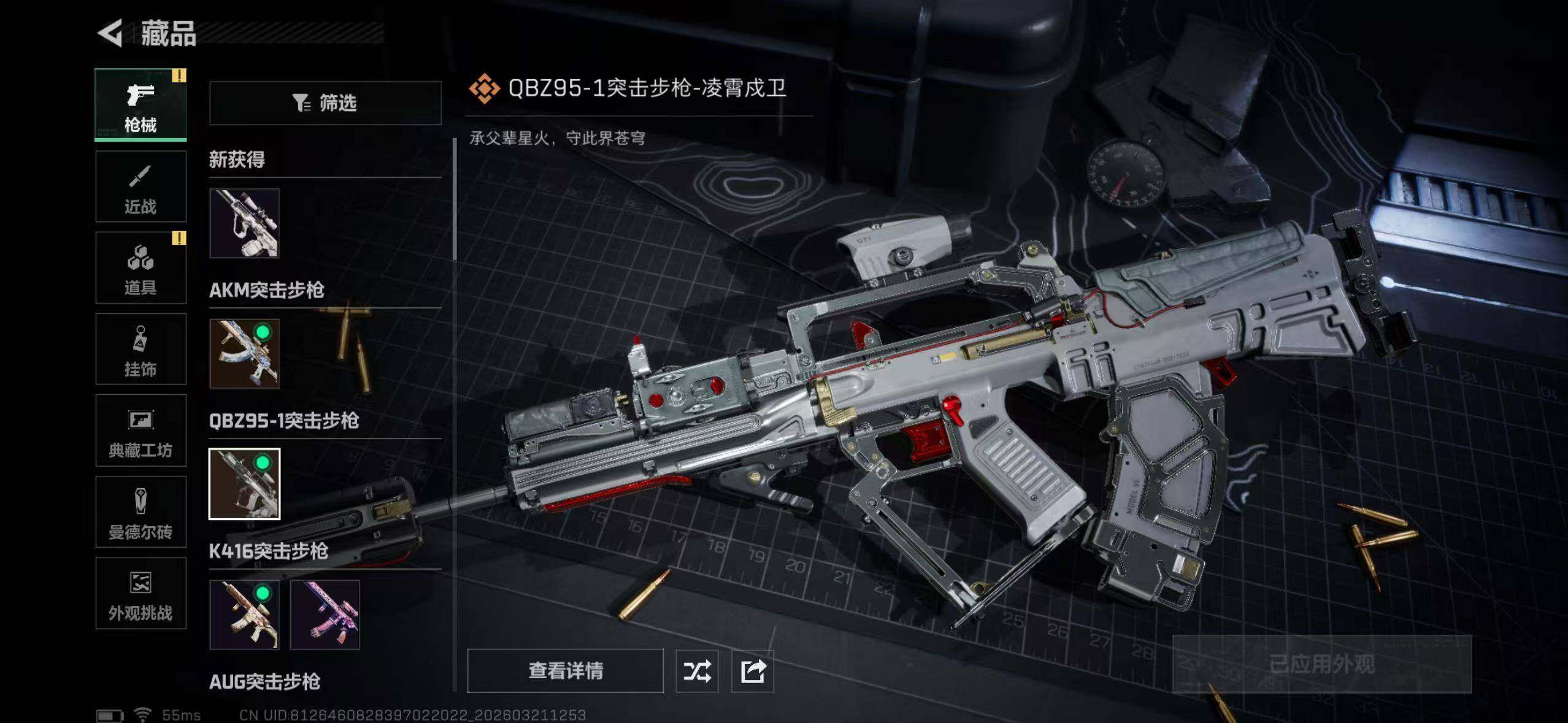 【传说外观】:AKM突击步枪-锦绣,QBZ95-1突击步枪-凌霄戍卫,AUG突击步枪-悠然茶歇,腾龙突击步枪-马年祥瑞,K437突击步枪-锦绣,MK47突击步枪-悠然茶歇,MK47突击步枪-暗星,UZI冲锋枪-悠然