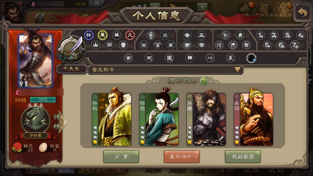 官阶:先锋将军;VIP等级:VIP1;史诗武将数量:1;动态皮肤数量:0;武将