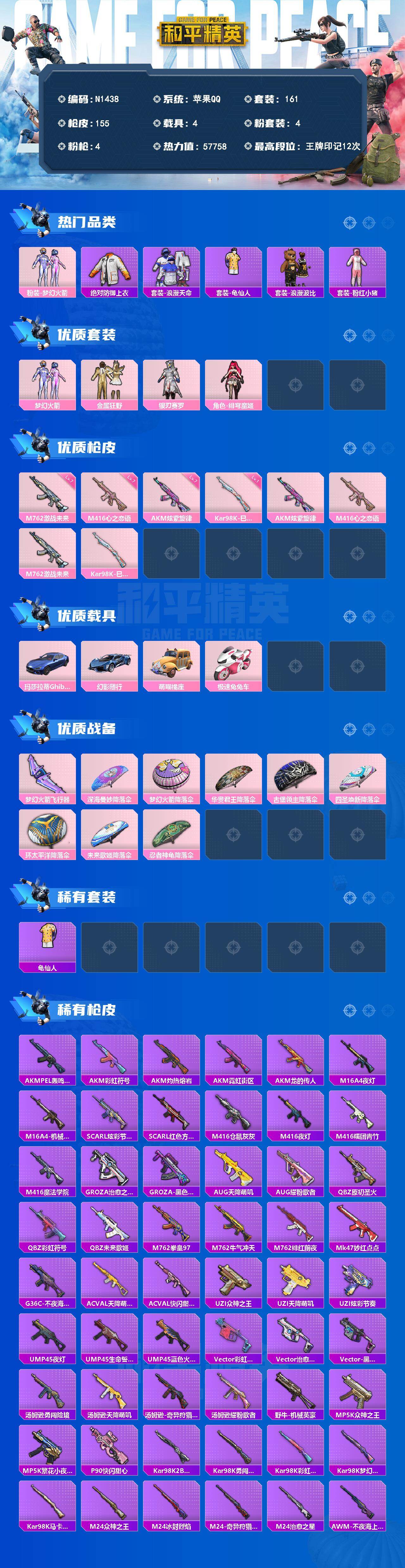 苹果 手Q-4粉装-4特效枪-4载具-1粉色飞行器-57758热力值-12王牌印记-161套装-155枪皮