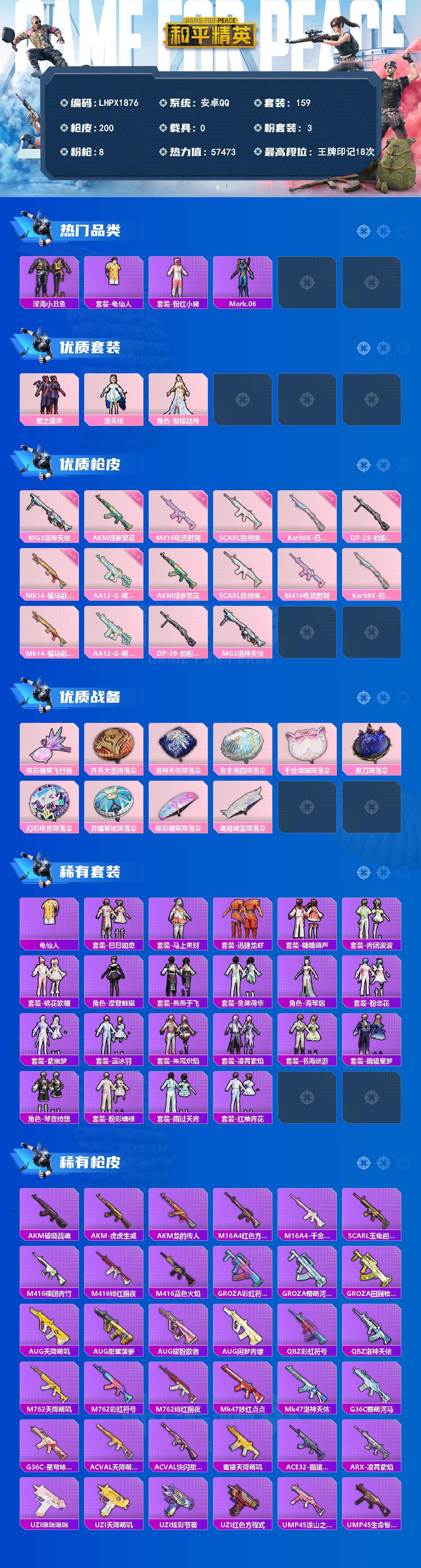 【特价出售/店主推荐】安卓 手Q-3粉装-8特效枪-1粉色飞行器-57473热力值-18王牌印记-159套装-200枪皮【热门品类】:套装-深海小丑鱼,套装-龟仙人,套装-粉红小猪,角色-Mark.06【粉色套装】:粉装-星之彼岸,角色-洛天依,角色-智耀战神【粉色枪皮等级】:AKM-绿萝繁花(五级),SCAR-L-锦绣绵绵(五级),M416-电玩时刻(五级),Kar98K-巳巳如意(五级),M