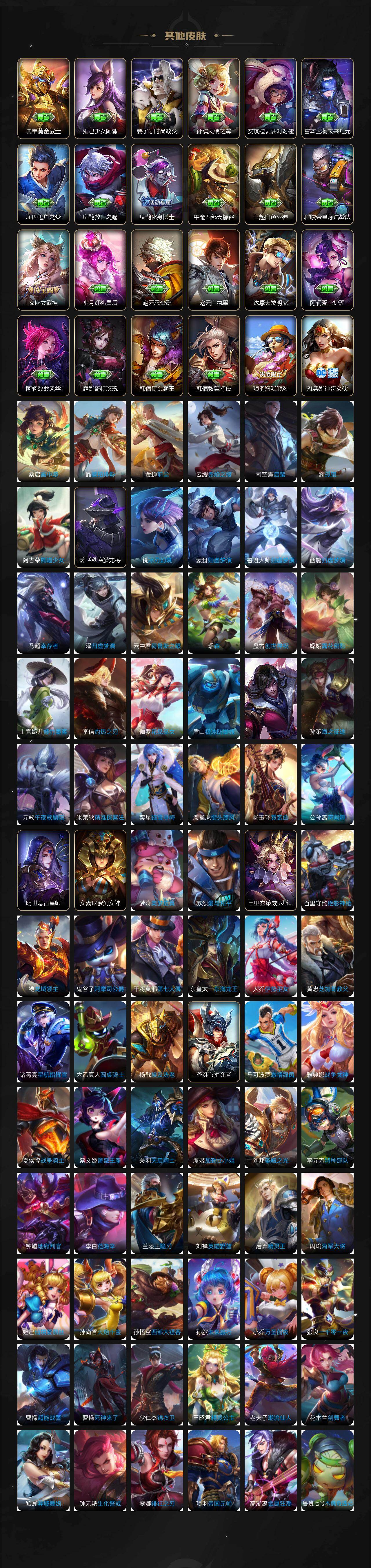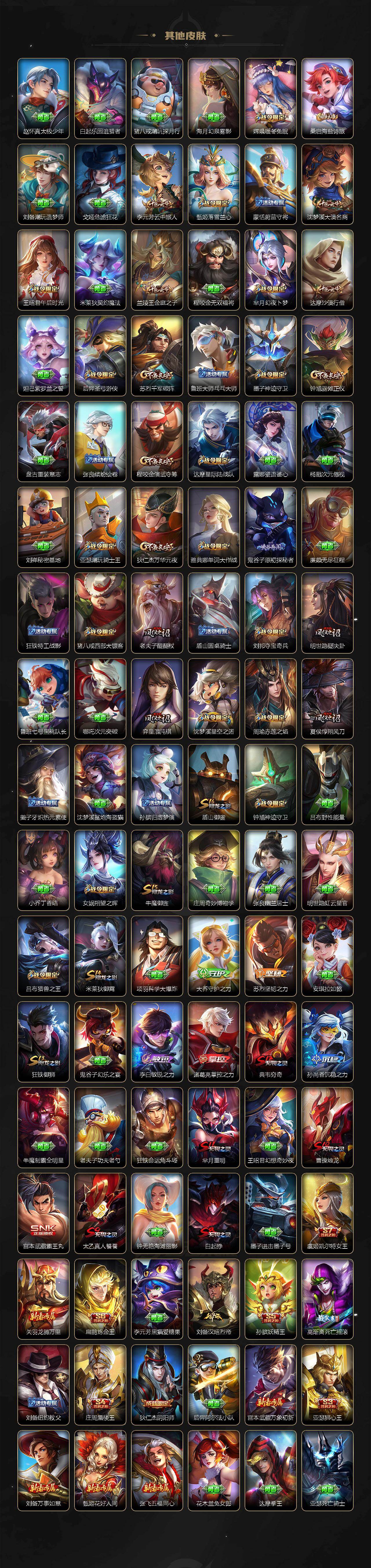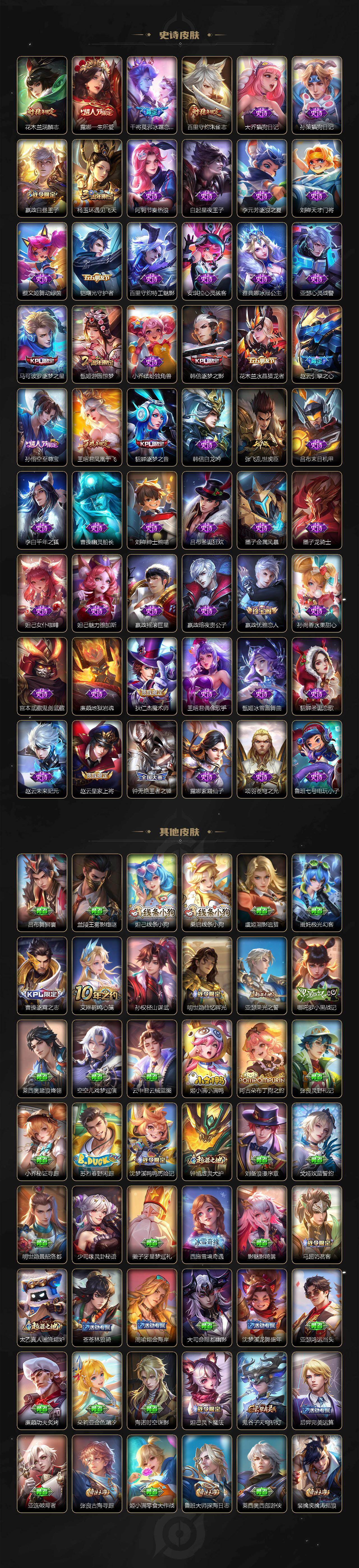 【传说皮肤】:后羿神树通天,云缨幻光神枪,夏洛特浮生妄,小乔山海琳琅生,不知火舞绯月行,马超无双飞将,大乔挚爱花嫁,孙尚香异界灵契,赵云淬星耀世,诸葛亮时雨天司,镜炽阳神光,虞姬启明星使,孙悟空零号赤焰,曜云鹰飞将,貂蝉猫影幻舞,干将莫邪久胜战神,百里玄策白虎志,后羿黄金射手座,貂蝉仲夏夜之梦,李白凤求凰,宫本