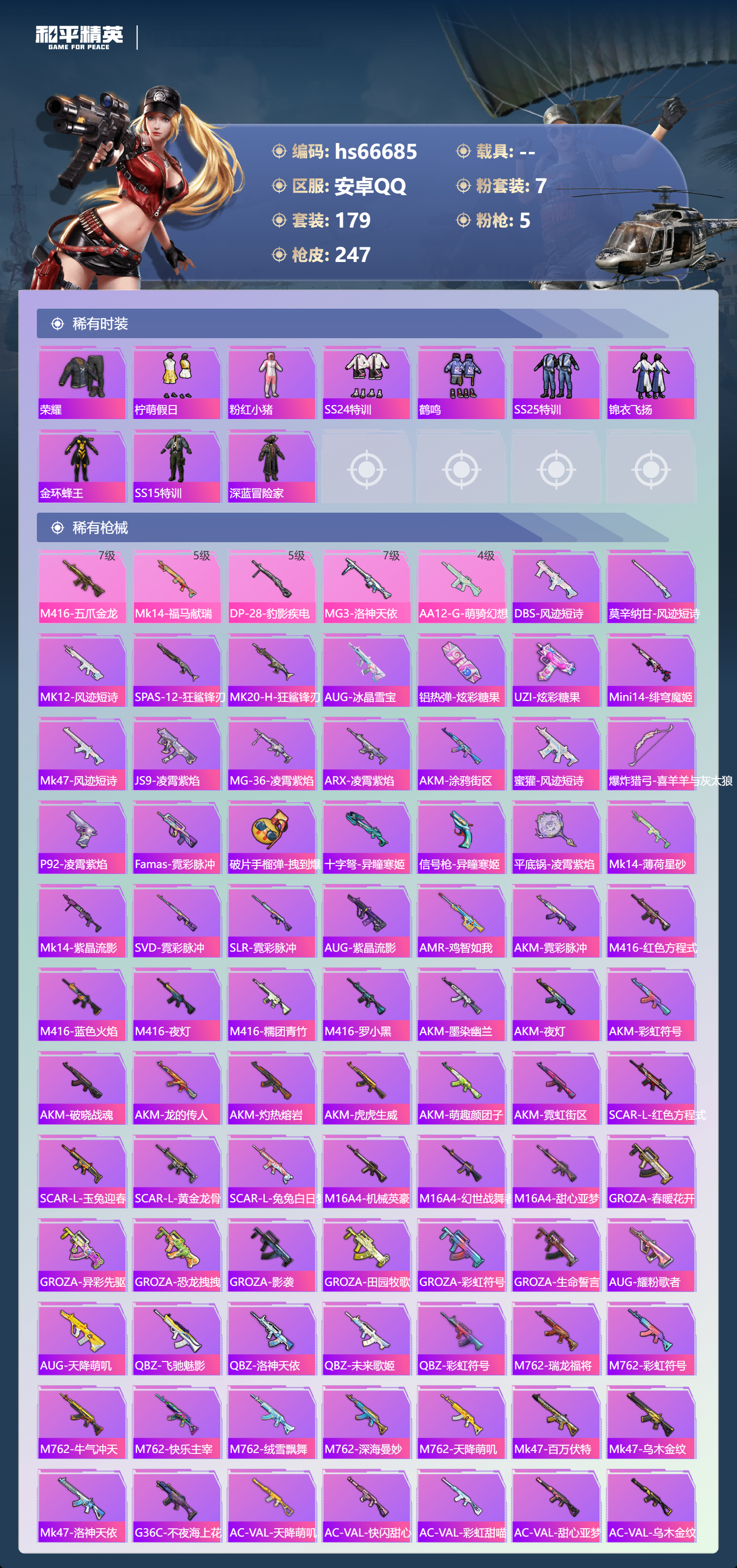 hs66685 安卓手Q-13王牌印记-7粉装-5特效枪-74317热力值-179套装-247枪皮-1卓越印记